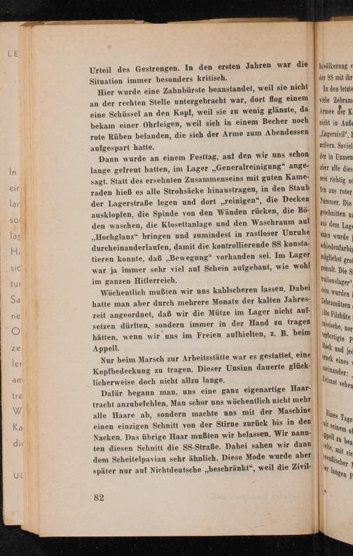 Dann wurde an einem Festtag, auf den wir uns schon lange gefreut hatten, im Lager ,, Generalreinigung“ angesagt. Statt des ersehnten Zusammenseins mit guten Kameraden hieß es alle Strohsäcke hinaustragen, in den Staub der Lagerstraße legen und dort ,, reinigen", die Decken ausklopfen, die Spinde von den Wänden rücken, die Böden waschen, die Klosettanlage und den Waschraum auf ,, Hochglanz" bringen und zumindest in rastloser Unruhe durcheinanderlaufen, damit die kontrollierende SS konsta
