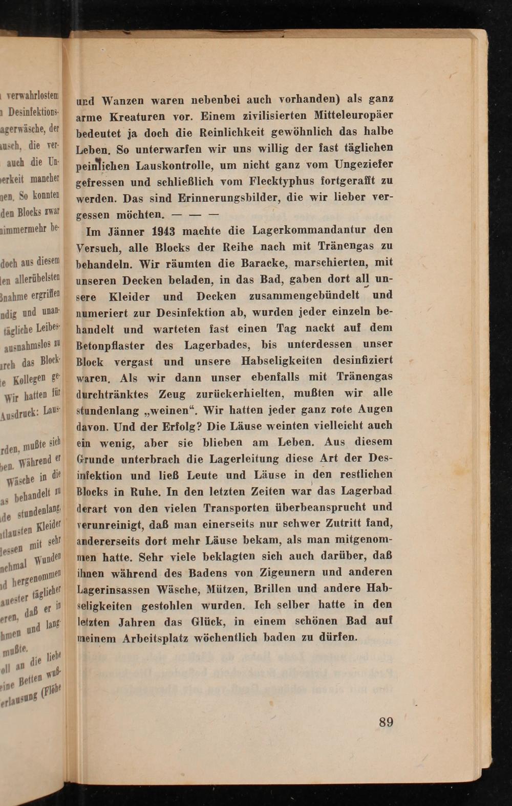 Im Jänner 1943 machte die Lagerkommandantur den Versuch, alle Blocks der Reihe nach mit Tränengas zu behandeln. Wir räumten die Baracke, marschierten, mit unseren Decken beladen, in das Bad, gaben dort all unsere Kleider und Decken zusammengebündelt numeriert zur Desinfektion ab, wurden jeder einzeln behandelt und warteten fast einen Tag nackt auf dem Betonpflaster des Lagerbades, bis unterdessen unser Block vergast und unsere Habseligkeiten desinfiziert waren. Als wir dann unser ebenfalls mit Tränengas durchtränktes Zeug zurückerhielten, mußten wir alle stundenlang ,, weinen". Wir hatten jeder ganz rote Augen davon. Und der Erfolg? Die Läuse weinten vielleicht auch ein wenig, aber sie blieben am Leben. Aus diesem Grunde unterbrach die Lagerleitung diese Art der Desinfektion und ließ Leute und Läuse in den restlichen Blocks in Ruhe. In den letzten Zeiten war das Lagerbad derart von den vielen Transporten überbeansprucht und verunreinigt, daß man einerseits nur schwer Zutritt fand, andererseits dort mehr Läuse bekam, als man mitgenommen hatte. Sehr viele beklagten sich auch darüber, daß ihnen während des Badens von Zigeunern und anderen