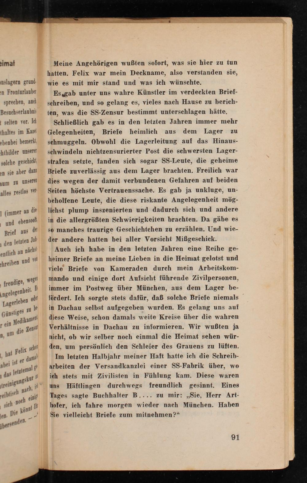 Auch ich habe in den letzten Jahren eine Reihe geheimer Briefe an meine Lieben in die Heimat gelotst und viele Briefe von Kameraden durch mein Arbeitskommando und einige dort Aufsicht führende Zivilpersonen, immer im Postweg über München , aus dem Lager befördert. Ich sorgte stets dafür, daß solche Briefe niemals in Dachau selbst aufgegeben wurden. Es gelang uns auf diese Weise, schon damals weite Kreise über die wahren Verhältnisse in Dachau zu informieren. Wir wußten ja nicht, ob wir selber noch einmal die Heimat sehen würden, um persönlich den Schleier des Grauens zu lüften. Im letzten Halbjahr meiner Haft hatte ich die Schreibarbeiten der Versandkanzlei einer SS- Fabrik über, wo ich stets mit Zivilisten in Fühlung kam. Diese waren uns Häftlingen durchwegs freundlich gesinnt. Eines Tages sagte Buchhalter B.... zu mir:„ ,, Sie, Herr Arthofer, ich fahre morgen wieder nach München . Haben Sie vielleicht Briefe zum mitnehmen?"