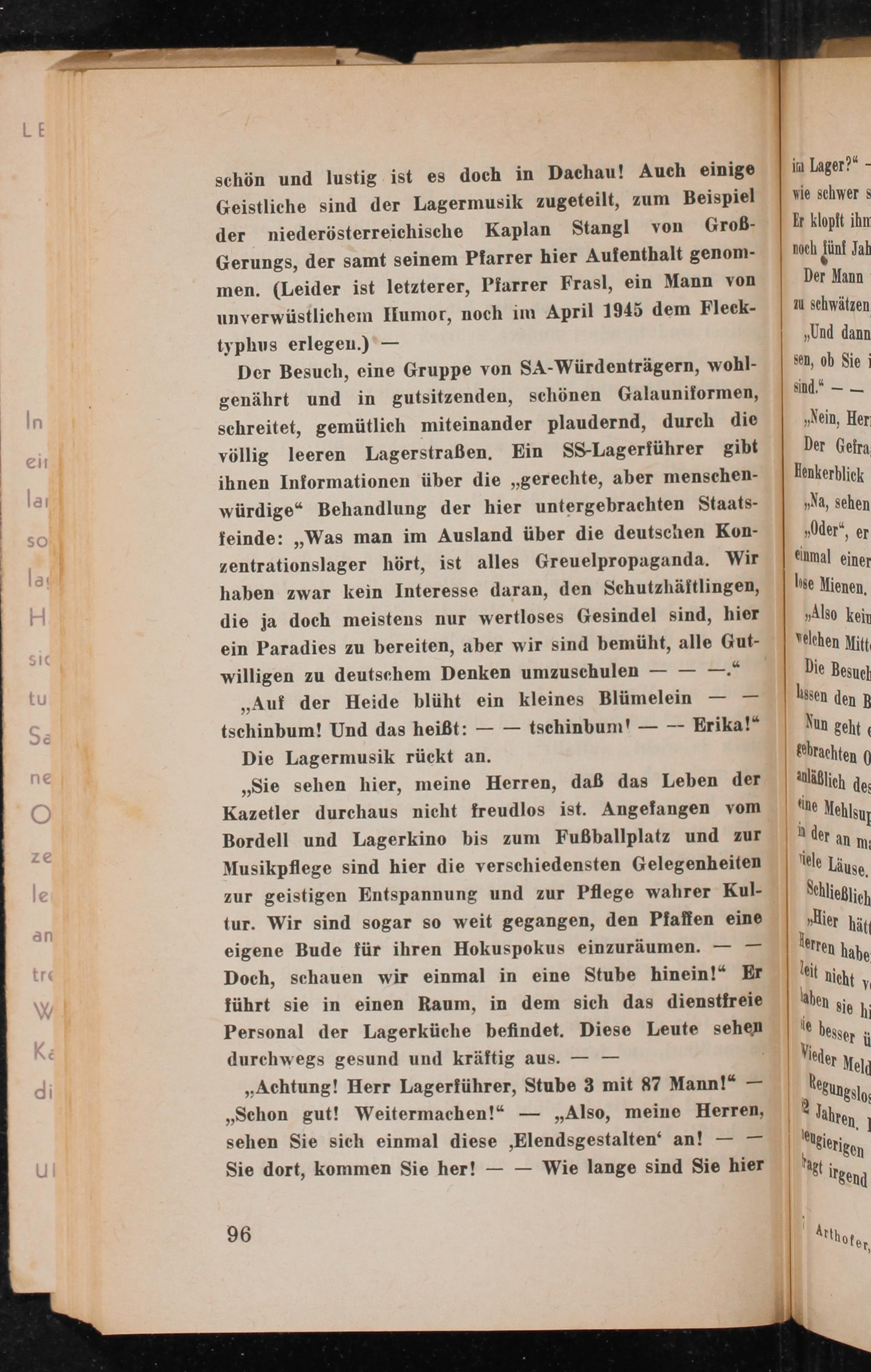 Der Besuch, eine Gruppe von SA- Würdenträgern, wohlgenährt und in gutsitzenden, schönen Galauniformen, schreitet, gemütlich miteinander plaudernd, durch die völlig leeren Lagerstraßen. Ein SS- Lagerführer gibt ihnen Informationen über die gerechte, aber menschenwürdige" Behandlung der hier untergebrachten Staatsfeinde: ,, Was man im Ausland über die deutschen Konzentrationslager hört, ist alles Greuelpropaganda. Wir haben zwar kein Interesse daran, den Schutzhäftlingen, die ja doch meistens nur wertloses Gesindel sind, hier ein Paradies zu bereiten, aber wir sind bemüht, alle Gutwilligen zu deutschem Denken umzuschulen ,, Auf der Heide blüht ein kleines Blümelein tschinbum!- tschinbum! Und das heißt: Die Lagermusik rückt an.