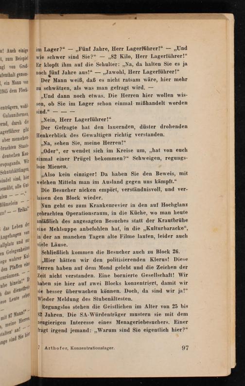 Schließlich kommen die Besucher auch zu Block 26. ,, Hier hätten wir den politisierenden Klerus! Diese Herren haben auf dem Mond gelebt und die Zeichen der Zeit nicht verstanden. Eine bornierte Gesellschaft! Wir haben sie hier auf zwei Blocks konzentriert, damit wir sie besser überwachen können. Doch, da sind wir ja!" Wieder Meldung des Stubenältesten.