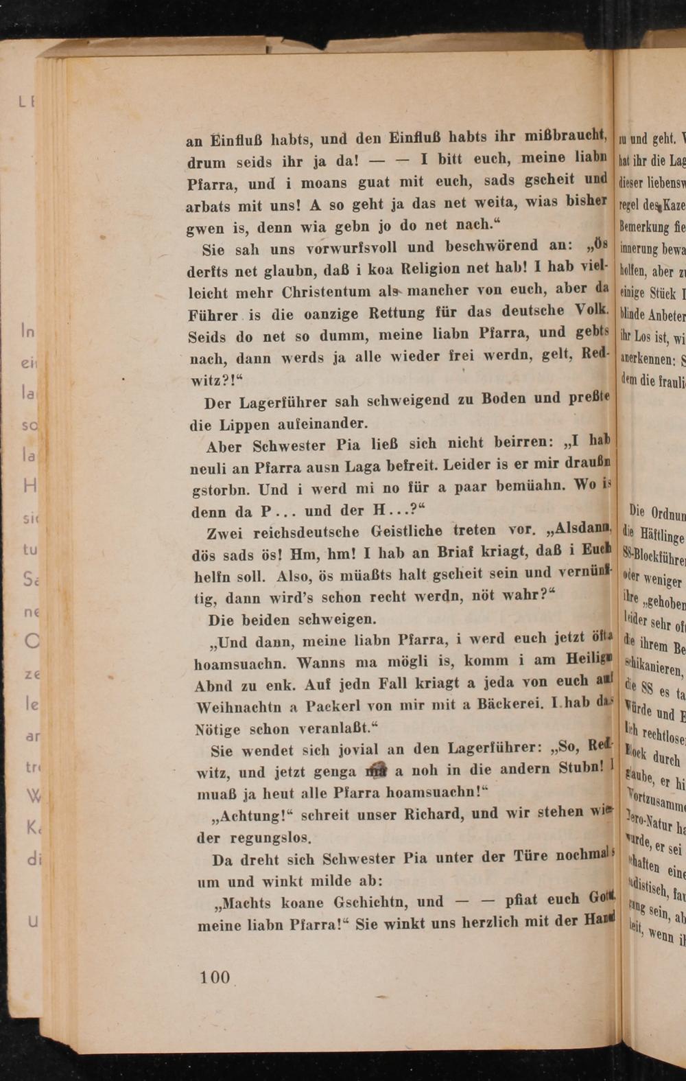 Sie sah uns vorwurfs voll und beschwörend an:„, Ös derfts net glaubn, daß i koa Religion net hab! I hab vielleicht mehr Christentum als mancher von euch, aber da Führer is die oanzige Rettung für das deutsche Volk. Seids do net so dumm, meine liabn Pfarra, und gebts nach, dann werds ja alle wieder frei werdn, gelt, Red- anerkennen: S
