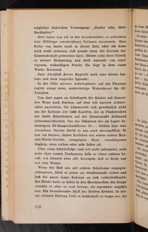 Drei Jahre war ich in der Gewürzmühle; es arbeiteten hier Häftlinge verschiedener Nationen zusammen. Eine Reihe von ihnen starb in dieser Zeit, aber ich kann mich nicht erinnern, daß jemals einer die Gesetze der Kameradschaft gebrochen hätte. Düster steht diese Fabrik in meiner Erinnerung und doch umrankt von einer eigenen, wehmütigen Poesie. Sie liegt in dem einen Worte: Kamerad.