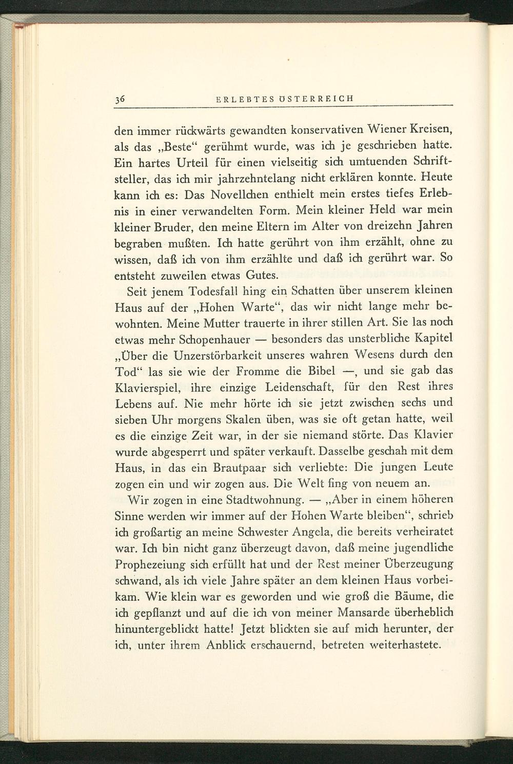 Seit jenem Todesfall hing ein Schatten über unserem kleinen Haus auf der„, Hohen Warte", das wir nicht lange mehr bewohnten. Meine Mutter trauerte in ihrer stillen Art. Sie las noch etwas mehr Schopenhauer - besonders das unsterbliche Kapitel , Über die Unzerstörbarkeit unseres wahren Wesens durch den Tod" las sie wie der Fromme die Bibel, und sie gab das Klavierspiel, ihre einzige Leidenschaft, für den Rest ihres Lebens auf. Nie mehr hörte ich sie jetzt zwischen sechs und sieben Uhr morgens Skalen üben, was sie oft getan hatte, weil es die einzige Zeit war, in der sie niemand störte. Das Klavier wurde abgesperrt und später verkauft. Dasselbe geschah mit dem Haus, in das ein Brautpaar sich verliebte: Die jungen Leute zogen ein und wir zogen aus. Die Welt fing von neuem an. Wir zogen in eine Stadtwohnung. ,, Aber in einem höheren Sinne werden wir immer auf der Hohen Warte bleiben“, schrieb ich großartig an meine Schwester Angela, die bereits verheiratet war. Ich bin nicht ganz überzeugt davon, daß meine jugendliche Prophezeiung sich erfüllt hat und der Rest meiner Überzeugung schwand, als ich viele Jahre später an dem kleinen Haus vorbeikam. Wie klein war es geworden und wie groß die Bäume, die ich gepflanzt und auf die ich von meiner Mansarde überheblich hinuntergeblickt hatte! Jetzt blickten sie auf mich herunter, der ich, unter ihrem Anblick erschauernd, betreten weiterhastete.