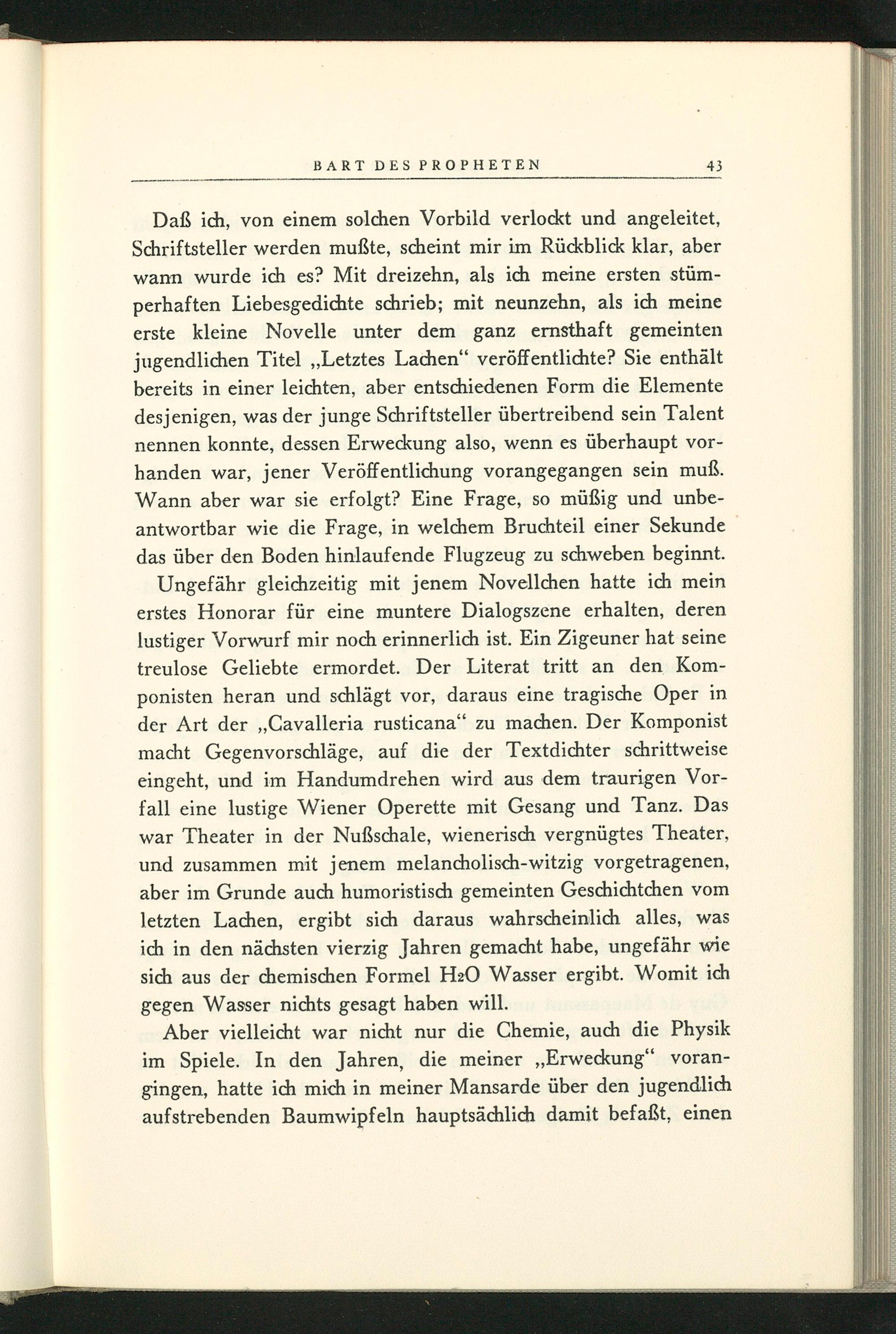 Daß ich, von einem solchen Vorbild verlockt und angeleitet, Schriftsteller werden mußte, scheint mir im Rückblick klar, aber wann wurde ich es? Mit dreizehn, als ich meine ersten stümperhaften Liebesgedichte schrieb; mit neunzehn, als ich meine erste kleine Novelle unter dem ganz ernsthaft gemeinten jugendlichen Titel ,, Letztes Lachen" veröffentlichte? Sie enthält bereits in einer leichten, aber entschiedenen Form die Elemente desjenigen, was der junge Schriftsteller übertreibend sein Talent nennen konnte, dessen Erweckung also, wenn es überhaupt vorhanden war, jener Veröffentlichung vorangegangen sein muß. Wann aber war sie erfolgt? Eine Frage, so müßig und unbeantwortbar wie die Frage, in welchem Bruchteil einer Sekunde das über den Boden hinlaufende Flugzeug zu schweben beginnt. Ungefähr gleichzeitig mit jenem Novellchen hatte ich mein erstes Honorar für eine muntere Dialogszene erhalten, deren lustiger Vorwurf mir noch erinnerlich ist. Ein Zigeuner hat seine treulose Geliebte ermordet. Der Literat tritt an den Komponisten heran und schlägt vor, daraus eine tragische Oper in der Art der ,, Cavalleria rusticana " zu machen. Der Komponist macht Gegenvorschläge, auf die der Textdichter schrittweise eingeht, und im Handumdrehen wird aus dem traurigen Vorfall eine lustige Wiener Operette mit Gesang und Tanz. Das war Theater in der Nußschale, wienerisch vergnügtes Theater, und zusammen mit jenem melancholisch- witzig vorgetragenen, aber im Grunde auch humoristisch gemeinten Geschichtchen vom letzten Lachen, ergibt sich daraus wahrscheinlich alles, was ich in den nächsten vierzig Jahren gemacht habe, ungefähr wie sich aus der chemischen Formel H2O Wasser ergibt. Womit ich gegen Wasser nichts gesagt haben will.