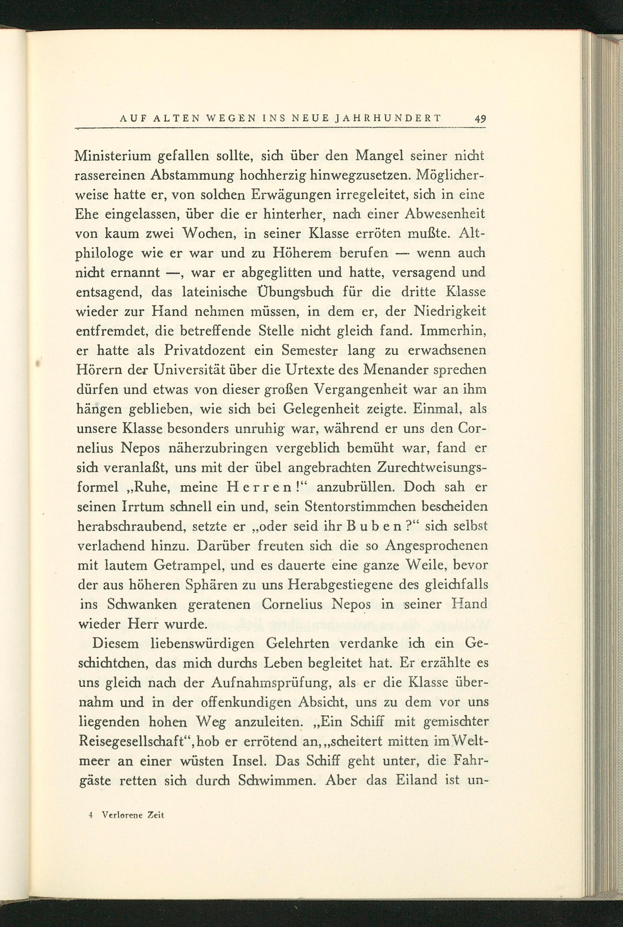 nicht ernannt, war er abgeglitten und hatte, versagend und entsagend, das lateinische Übungsbuch für die dritte Klasse wieder zur Hand nehmen müssen, in dem er, der Niedrigkeit entfremdet, die betreffende Stelle nicht gleich fand. Immerhin, er hatte als Privatdozent ein Semester lang zu erwachsenen Hörern der Universität über die Urtexte des Menander sprechen dürfen und etwas von dieser großen Vergangenheit war an ihm hängen geblieben, wie sich bei Gelegenheit zeigte. Einmal, als unsere Klasse besonders unruhig war, während er uns den Cornelius Nepos näherzubringen vergeblich bemüht war, fand er sich veranlaßt, uns mit der übel angebrachten Zurechtweisungsformel ,, Ruhe, meine Herren!" anzubrüllen. Doch sah er seinen Irrtum schnell ein und, sein Stentorstimmchen bescheiden herabschraubend, setzte er ,, oder seid ihr Buben?" sich selbst verlachend hinzu. Darüber freuten sich die so Angesprochenen mit lautem Getrampel, und es dauerte eine ganze Weile, bevor der aus höheren Sphären zu uns Herabgestiegene des gleichfalls ins Schwanken geratenen Cornelius Nepos in seiner Hand wieder Herr wurde.