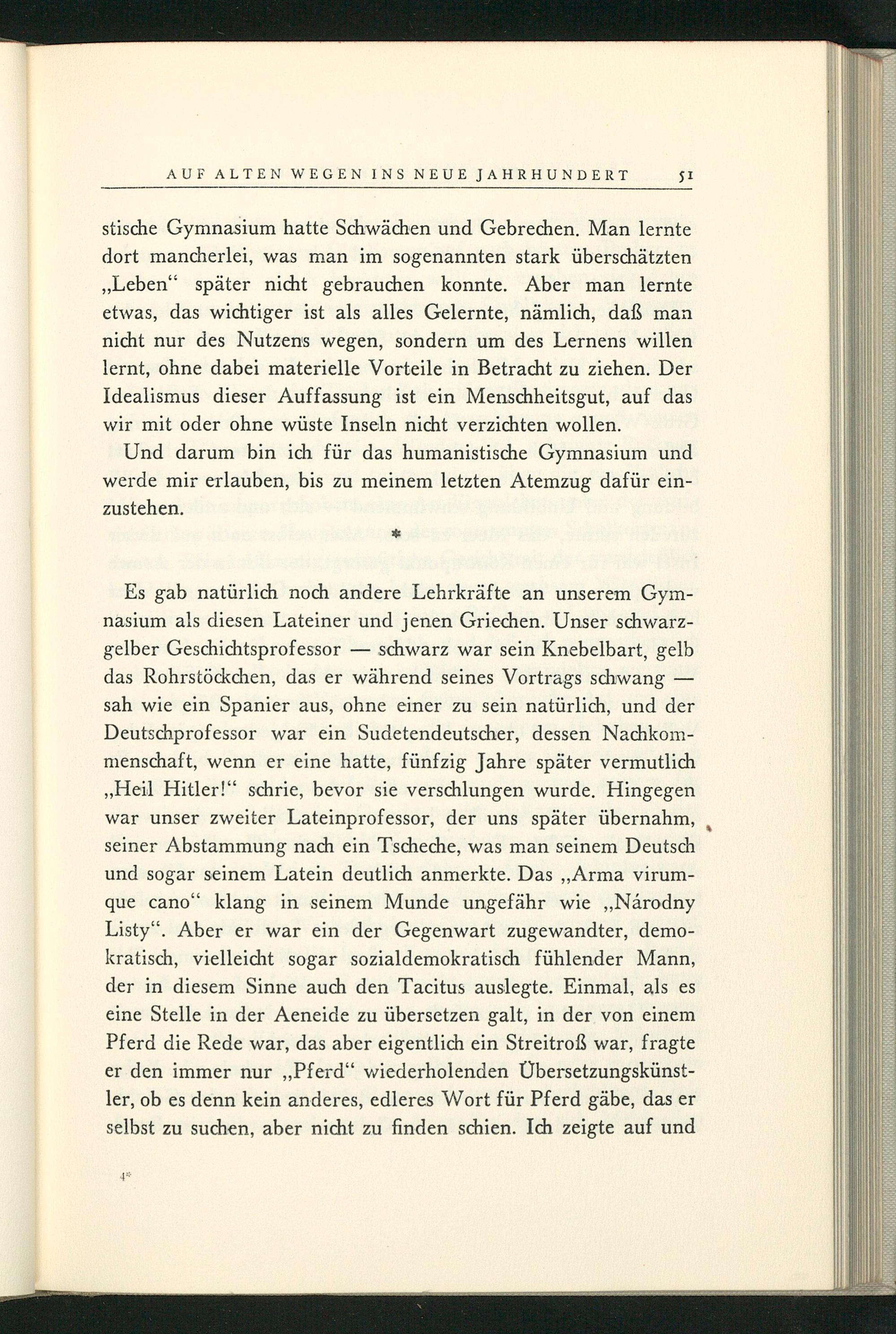Es gab natürlich noch andere Lehrkräfte an unserem Gymnasium als diesen Lateiner und jenen Griechen. Unser schwarzgelber Geschichtsprofessor- schwarz war sein Knebelbart, gelb das Rohrstöckchen, das er während seines Vortrags schwang sah wie ein Spanier aus, ohne einer zu sein natürlich, und der Deutschprofessor war ein Sudetendeutscher, dessen Nachkommenschaft, wenn er eine hatte, fünfzig Jahre später vermutlich ,, Heil Hitler !" schrie, bevor sie verschlungen wurde. Hingegen war unser zweiter Lateinprofessor, der uns später übernahm, seiner Abstammung nach ein Tscheche, was man seinem Deutsch und sogar seinem Latein deutlich anmerkte. Das ,, Arma virumque cano" klang in seinem Munde ungefähr wie„ Národny Listy". Aber er war ein der Gegenwart zugewandter, demokratisch, vielleicht sogar sozialdemokratisch fühlender Mann, der in diesem Sinne auch den Tacitus auslegte. Einmal, als es eine Stelle in der Aeneide zu übersetzen galt, in der von einem Pferd die Rede war, das aber eigentlich ein Streitroẞ war, fragte er den immer nur ,, Pferd" wiederholenden Übersetzungskünstler, ob es denn kein anderes, edleres Wort für Pferd gäbe, das er selbst zu suchen, aber nicht zu finden schien. Ich zeigte auf und