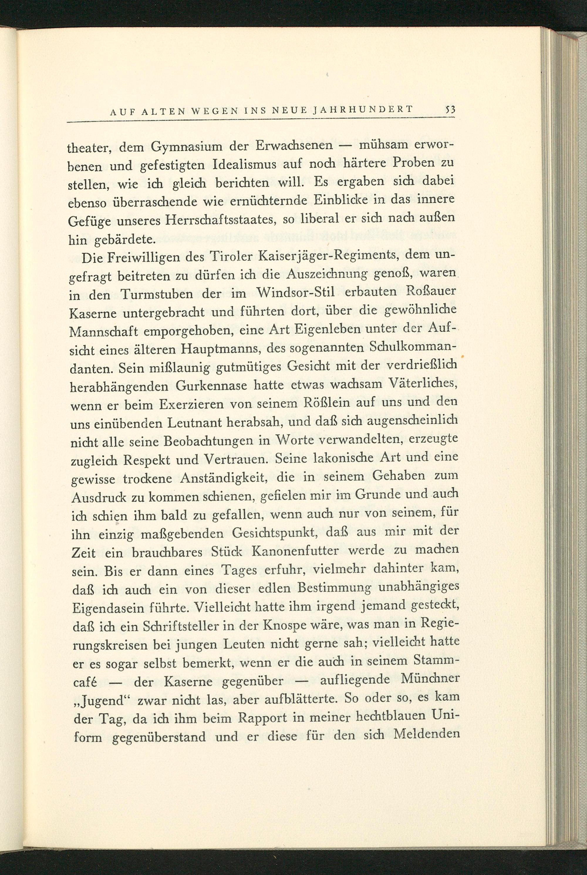 Die Freiwilligen des Tiroler Kaiserjäger- Regiments, dem ungefragt beitreten zu dürfen ich die Auszeichnung genoß, waren in den Turmstuben der im Windsor- Stil erbauten Roẞauer Kaserne untergebracht und führten dort, über die gewöhnliche Mannschaft emporgehoben, eine Art Eigenleben unter der Aufsicht eines älteren Hauptmanns, des sogenannten Schulkommandanten. Sein mißlaunig gutmütiges Gesicht mit der verdrießlich herabhängenden Gurkennase hatte etwas wachsam Väterliches, wenn er beim Exerzieren von seinem Rößlein auf uns und den uns einübenden Leutnant herabsah, und daß sich augenscheinlich nicht alle seine Beobachtungen in Worte verwandelten, erzeugte zugleich Respekt und Vertrauen. Seine lakonische Art und eine gewisse trockene Anständigkeit, die in seinem Gehaben zum Ausdruck zu kommen schienen, gefielen mir im Grunde und auch ich schien ihm bald zu gefallen, wenn auch nur von seinem, für ihn einzig maßgebenden Gesichtspunkt, daß aus mir mit der Zeit ein brauchbares Stück Kanonenfutter werde zu machen sein. Bis er dann eines Tages erfuhr, vielmehr dahinter kam, daß ich auch ein von dieser edlen Bestimmung unabhängiges Eigendasein führte. Vielleicht hatte ihm irgend jemand gesteckt, daß ich ein Schriftsteller in der Knospe wäre, was man in Regierungskreisen bei jungen Leuten nicht gerne sah; vielleicht hatte er es sogar selbst bemerkt, wenn er die auch in seinem Stammcafé der Kaserne gegenüber aufliegende Münchner ,, Jugend" zwar nicht las, aber aufblätterte. So oder so, es kam der Tag, da ich ihm beim Rapport in meiner hechtblauen Uniform gegenüberstand und er diese für den sich Meldenden