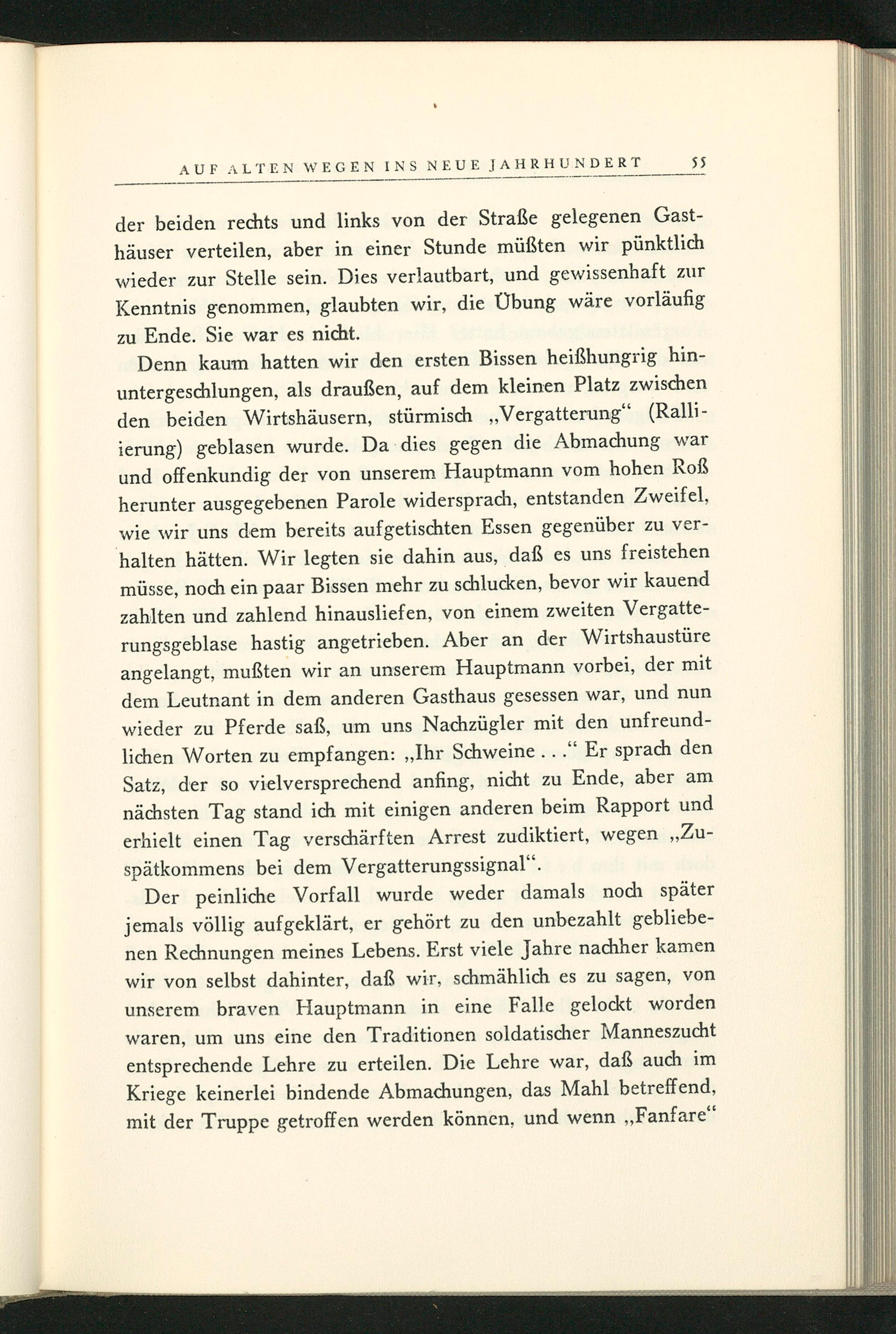 Denn kaum hatten wir den ersten Bissen heißhungrig hinuntergeschlungen, als draußen, auf dem kleinen Platz zwischen den beiden Wirtshäusern, stürmisch ,, Vergatterung"( Ralliierung) geblasen wurde. Da dies gegen die Abmachung war und offenkundig der von unserem Hauptmann vom hohen Roẞ herunter ausgegebenen Parole widersprach, entstanden Zweifel, wie wir uns dem bereits aufgetischten Essen gegenüber zu verhalten hätten. Wir legten sie dahin aus, daß es uns freistehen müsse, noch ein paar Bissen mehr zu schlucken, bevor wir kauend zahlten und zahlend hinausliefen, von einem zweiten Vergatterungsgeblase hastig angetrieben. Aber an der Wirtshaustüre angelangt, mußten wir an unserem Hauptmann vorbei, der mit dem Leutnant in dem anderen Gasthaus gesessen war, und nun wieder zu Pferde saß, um uns Nachzügler mit den unfreundlichen Worten zu empfangen:„, Ihr Schweine..." Er sprach den Satz, der so vielversprechend anfing, nicht zu Ende, aber am nächsten Tag stand ich mit einigen anderen beim Rapport und erhielt einen Tag verschärften Arrest zudiktiert, wegen ,, Zuspätkommens bei dem Vergatterungssignal".