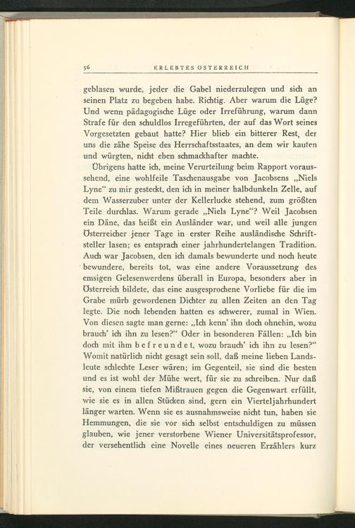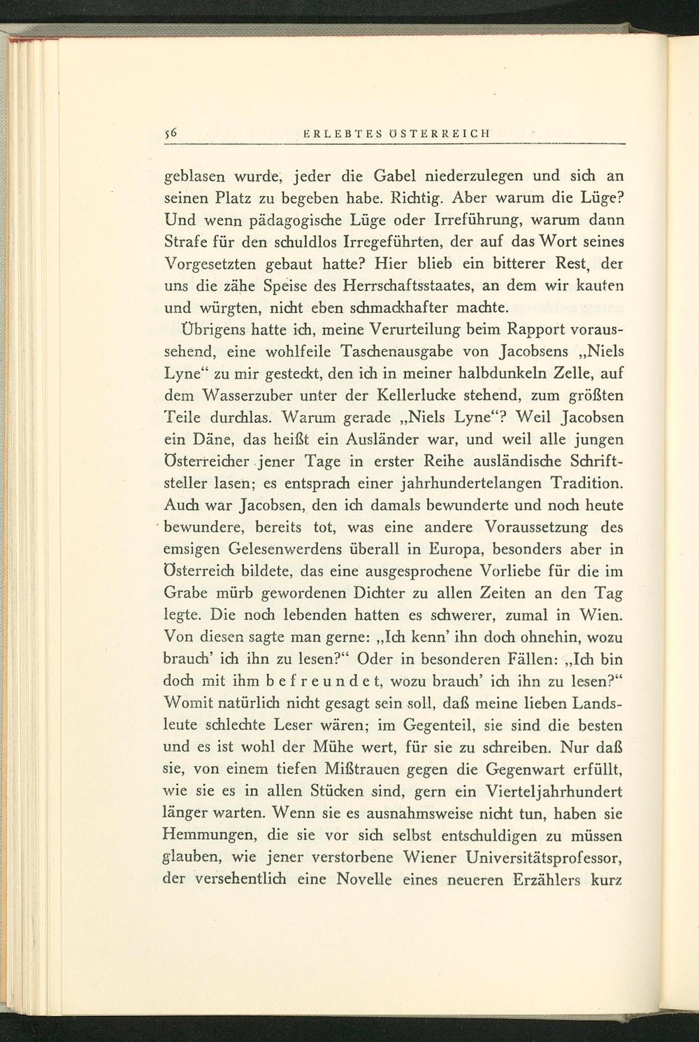 Übrigens hatte ich, meine Verurteilung beim Rapport voraus- sehend, eine wohlfeile Taschenausgabe von Jacobsens„Niels Lyne“ zu mir gesteckt, den ich in meiner halbdunkeln Zelle, auf dem Wasserzuber unter der Kellerlucke stehend, zum größten Teile durchlas. Warum gerade„Niels Lyne“? Weil Jacobsen ein Däne, das heißt ein Ausländer war, und weil alle jungen Österreicher ‚jener Tage in erster Reihe ausländische Schrift- steller lasen; es entsprach einer jahrhundertelangen Tradition. Auch war Jacobsen, den ich damals bewunderte und noch heute ‘bewundere, bereits tot, was eine andere Voraussetzung des emsigen Gelesenwerdens überall in Europa , besonders aber in Österreich bildete, das eine ausgesprochene Vorliebe für die im Grabe mürb gewordenen Dichter zu allen Zeiten an den Tag legte. Die noch lebenden hatten es schwerer, zumal in Wien . Von diesen sagte man gerne:„Ich kenn’ ihn doch ohnehin, wozu brauch’ ich ihn zu lesen?“ Oder in besonderen Fällen:„Ich bin doch mit ihm befreundet, wozu brauch’ ich ihn zu lesen?“ Womit natürlich nicht gesagt sein soll, daß meine lieben Lands- leute schlechte Leser wären; im Gegenteil, sie sind die besten und es ist wohl der Mühe wert, für sie zu schreiben. Nur daß sie, von einem tiefen Mißtrauen gegen die Gegenwart erfüllt, wie sie es in allen Stücken sind, gern ein Vierteljahrhundert