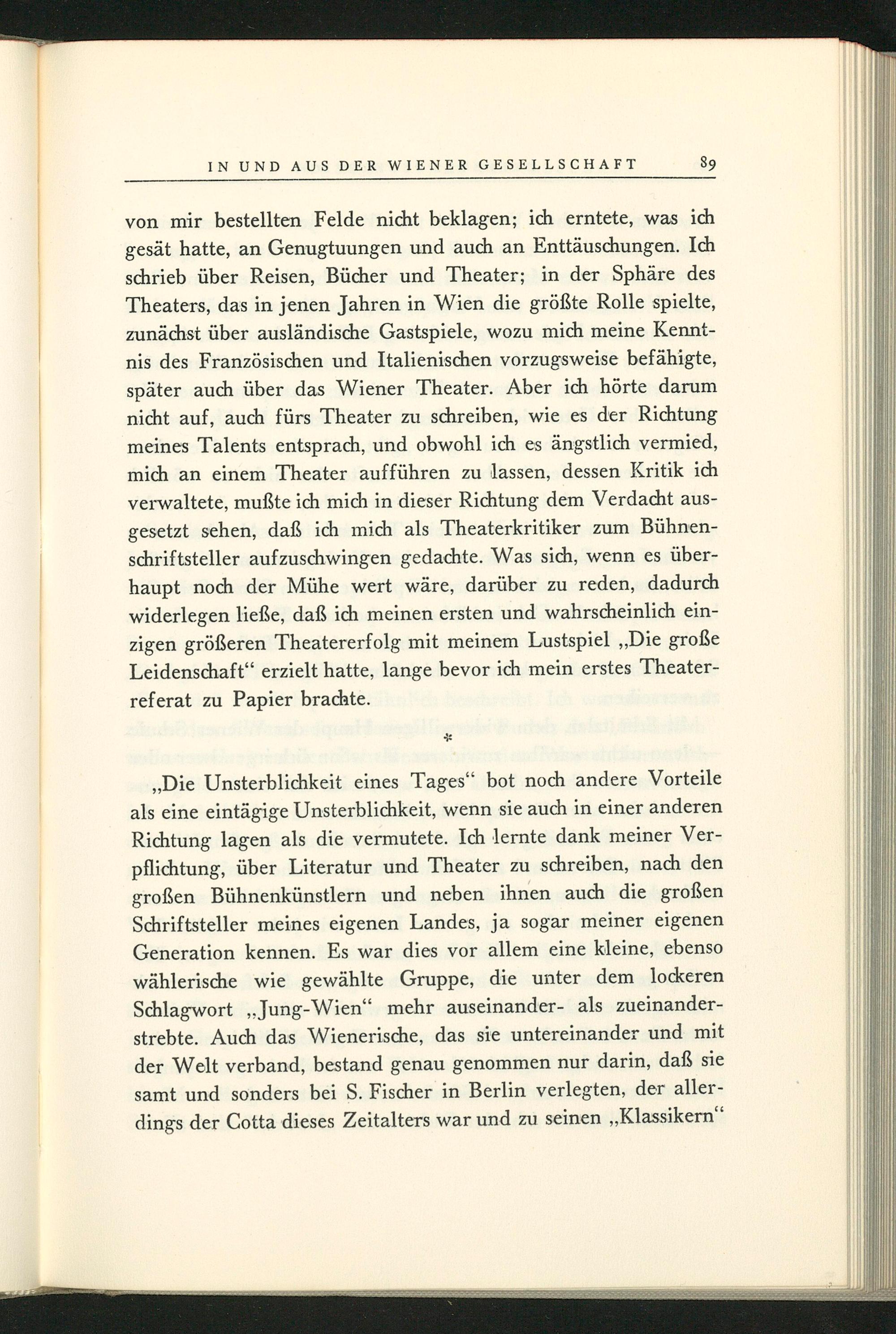 ,, Die Unsterblichkeit eines Tages" bot noch andere Vorteile als eine eintägige Unsterblichkeit, wenn sie auch in einer anderen Richtung lagen als die vermutete. Ich lernte dank meiner Verpflichtung, über Literatur und Theater zu schreiben, nach den großen Bühnenkünstlern und neben ihnen auch die großen Schriftsteller meines eigenen Landes, ja sogar meiner eigenen Generation kennen. Es war dies vor allem eine kleine, ebenso wählerische wie gewählte Gruppe, die unter dem lockeren Schlagwort ,, Jung- Wien " mehr auseinander- als zueinanderstrebte. Auch das Wienerische, das sie untereinander und mit der Welt verband, bestand genau genommen nur darin, daß sie samt und sonders bei S. Fischer in Berlin verlegten, der allerdings der Cotta dieses Zeitalters war und zu seinen ,, Klassikern"