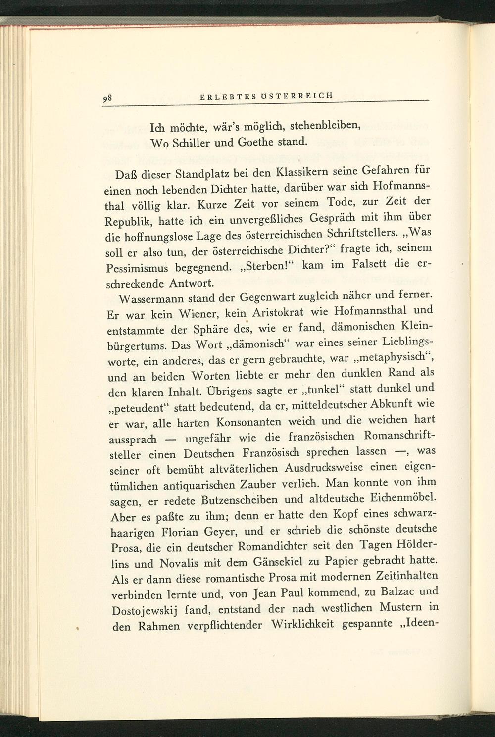 Wassermann stand der Gegenwart zugleich näher und ferner. Er war kein Wiener, kein Aristokrat wie Hofmannsthal und entstammte der Sphäre des, wie er fand, dämonischen Kleinbürgertums. Das Wort ,, dämonisch" war eines seiner Lieblingsworte, ein anderes, das er gern gebrauchte, war ,, metaphysisch", und an beiden Worten liebte er mehr den dunklen Rand als den klaren Inhalt. Übrigens sagte er ,, tunkel" statt dunkel und ,, peteudent" statt bedeutend, da er, mitteldeutscher Abkunft wie er war, alle harten Konsonanten weich und die weichen hart aussprach ungefähr wie die französischen Romanschriftsteller einen Deutschen Französisch sprechen lassen-, was seiner oft bemüht altväterlichen Ausdrucksweise einen eigentümlichen antiquarischen Zauber verlieh. Man konnte von ihm sagen, er redete Butzenscheiben und altdeutsche Eichenmöbel. Aber es paẞte zu ihm; denn er hatte den Kopf eines schwarzhaarigen Florian Geyer , und er schrieb die schönste deutsche Prosa, die ein deutscher Romandichter seit den Tagen Hölderlins und Novalis mit dem Gänsekiel zu Papier gebracht hatte. Als er dann diese romantische Prosa mit modernen Zeitinhalten verbinden lernte und, von Jean Paul kommend, zu Balzac und Dostojewskij fand, entstand der nach westlichen Mustern in den Rahmen verpflichtender Wirklichkeit gespannte„, Ideen