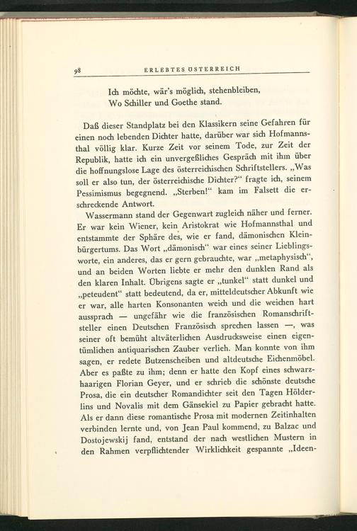 Daß dieser Standplatz bei den Klassikern seine Gefahren für einen noch lebenden Dichter hatte, darüber war sich Hofmannsthal völlig klar. Kurze Zeit vor seinem Tode, zur Zeit der Republik , hatte ich ein unvergeßliches Gespräch mit ihm über die hoffnungslose Lage des österreichischen Schriftstellers. ,, Was soll er also tun, der österreichische Dichter?" fragte ich, seinem Pessimismus begegnend.„, Sterben!" kam im Falsett die erschreckende Antwort.