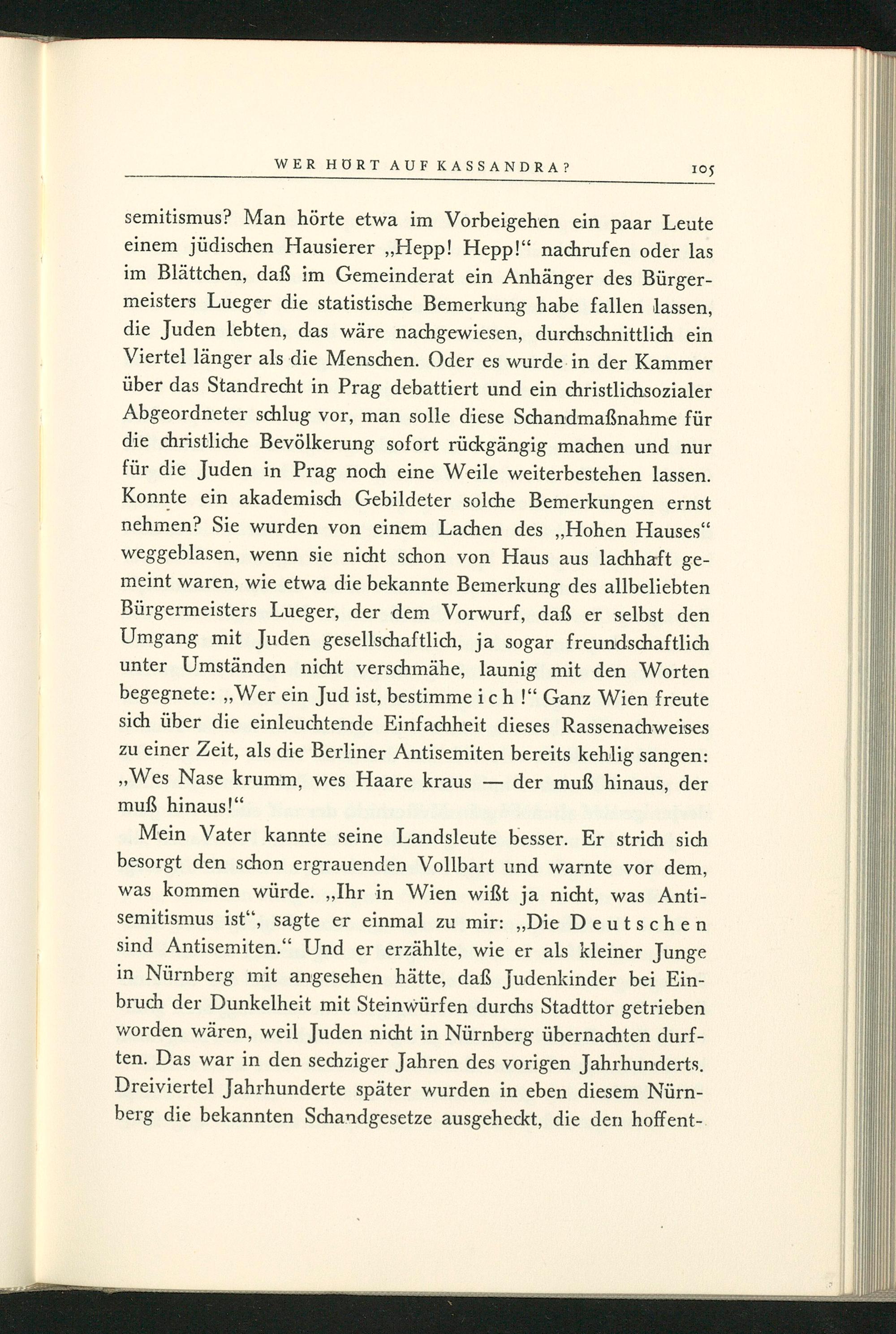 semitismus? Man hörte etwa im Vorbeigehen ein paar Leute einem jüdischen Hausierer ,, Hepp! Hepp!" nachrufen oder las im Blättchen, daß im Gemeinderat ein Anhänger des Bürgermeisters Lueger die statistische Bemerkung habe fallen lassen, die Juden lebten, das wäre nachgewiesen, durchschnittlich ein Viertel länger als die Menschen. Oder es wurde in der Kammer über das Standrecht in Prag debattiert und ein christlichsozialer Abgeordneter schlug vor, man solle diese Schandmaßnahme für die christliche Bevölkerung sofort rückgängig machen und nur für die Juden in Prag noch eine Weile weiterbestehen lassen. Konnte ein akademisch Gebildeter solche Bemerkungen ernst nehmen? Sie wurden von einem Lachen des ,, Hohen Hauses" weggeblasen, wenn sie nicht schon von Haus aus lachhaft gemeint waren, wie etwa die bekannte Bemerkung des allbeliebten Bürgermeisters Lueger, der dem Vorwurf, daß er selbst den Umgang mit Juden gesellschaftlich, ja sogar freundschaftlich unter Umständen nicht verschmähe, launig mit den Worten begegnete: ,, Wer ein Jud ist, bestimme ich!" Ganz Wien freute sich über die einleuchtende Einfachheit dieses Rassenachweises zu einer Zeit, als die Berliner Antisemiten bereits kehlig sangen: ,, Wes Nase krumm, wes Haare kraus der muß hinaus, der muß hinaus!"