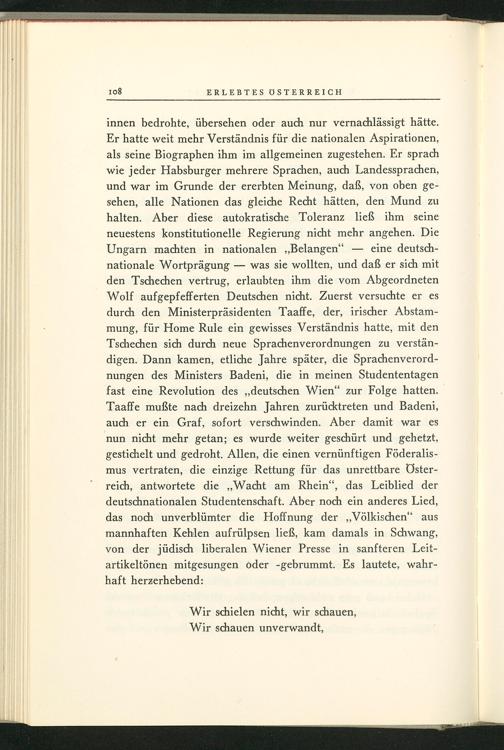 innen bedrohte, übersehen oder auch nur vernachlässigt hätte. Er hatte weit mehr Verständnis für die nationalen Aspirationen, als seine Biographen ihm im allgemeinen zugestehen. Er sprach wie jeder Habsburger mehrere Sprachen, auch Landessprachen, und war im Grunde der ererbten Meinung, daß, von oben gesehen, alle Nationen das gleiche Recht hätten, den Mund zu halten. Aber diese autokratische Toleranz ließ ihm seine neuestens konstitutionelle Regierung nicht mehr angehen. Die Ungarn machten in nationalen ,, Belangen" eine deutschnationale Wortprägung was sie wollten, und daß er sich mit den Tschechen vertrug, erlaubten ihm die vom Abgeordneten Wolf aufgepfefferten Deutschen nicht. Zuerst versuchte er es durch den Ministerpräsidenten Taaffe , der, irischer Abstammung, für Home Rule ein gewisses Verständnis hatte, mit den Tschechen sich durch neue Sprachenverordnungen zu verständigen. Dann kamen, etliche Jahre später, die Sprachenverordnungen des Ministers Badeni , die in meinen Studententagen fast eine Revolution des„, deutschen Wien " zur Folge hatten. Taaffe mußte nach dreizehn Jahren zurücktreten und Badeni , auch er ein Graf, sofort verschwinden. Aber damit war es nun nicht mehr getan; es wurde weiter geschürt und gehetzt, gestichelt und gedroht. Allen, die einen vernünftigen Föderalismus vertraten, die einzige Rettung für das unrettbare Österreich , antwortete die ,, Wacht am Rhein", das Leiblied der deutschnationalen Studentenschaft. Aber noch ein anderes Lied, das noch unverblümter die Hoffnung der„ Völkischen" aus mannhaften Kehlen aufrülpsen ließ, kam damals in Schwang, von der jüdisch liberalen Wiener Presse in sanfteren Leitartikeltönen mitgesungen oder-gebrummt. Es lautete, wahrhaft herzerhebend: