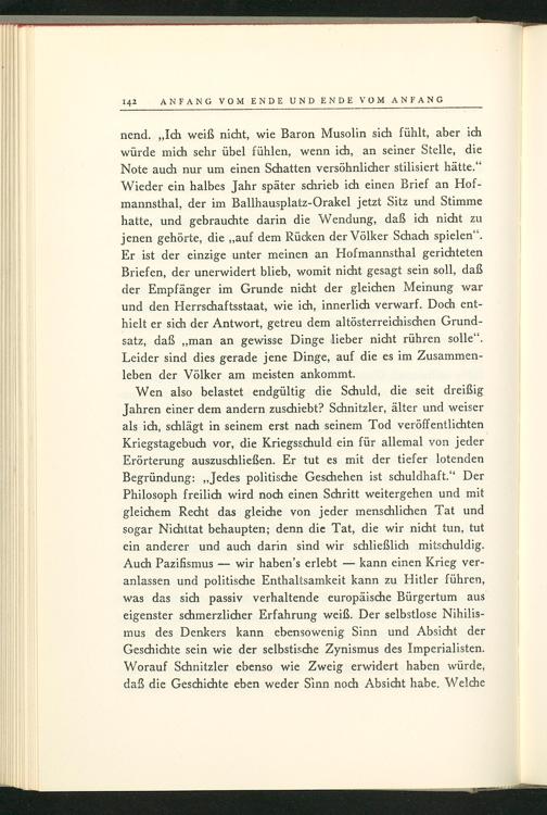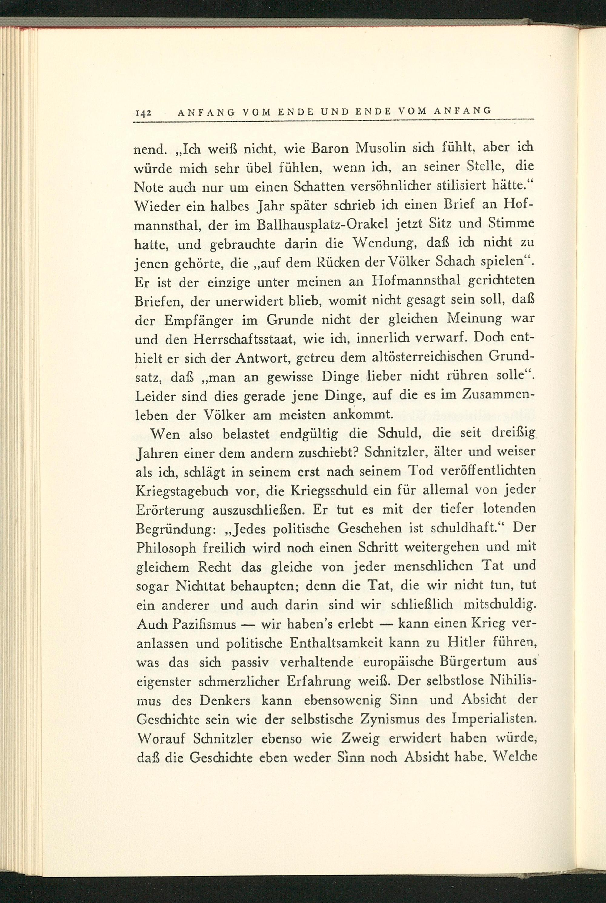 Wen also belastet endgültig die Schuld, die seit dreißig Jahren einer dem andern zuschiebt? Schnitzler, älter und weiser als ich, schlägt in seinem erst nach seinem Tod veröffentlichten Kriegstagebuch vor, die Kriegsschuld ein für allemal von jeder Erörterung auszuschließen. Er tut es mit der tiefer lotenden Begründung:„ Jedes politische Geschehen ist schuldhaft." Der Philosoph freilich wird noch einen Schritt weitergehen und mit gleichem Recht das gleiche von jeder menschlichen Tat und sogar Nichttat behaupten; denn die Tat, die wir nicht tun, tut ein anderer und auch darin sind wir schließlich mitschuldig. Auch Pazifismus- wir haben's erlebt- kann einen Krieg veranlassen und politische Enthaltsamkeit kann zu Hitler führen, was das sich passiv verhaltende europäische Bürgertum aus eigenster schmerzlicher Erfahrung weiß. Der selbstlose Nihilismus des Denkers kann ebensowenig Sinn und Absicht der Geschichte sein wie der selbstische Zynismus des Imperialisten. Worauf Schnitzler ebenso wie Zweig erwidert haben würde, daß die Geschichte eben weder Sinn noch Absicht habe. Welche