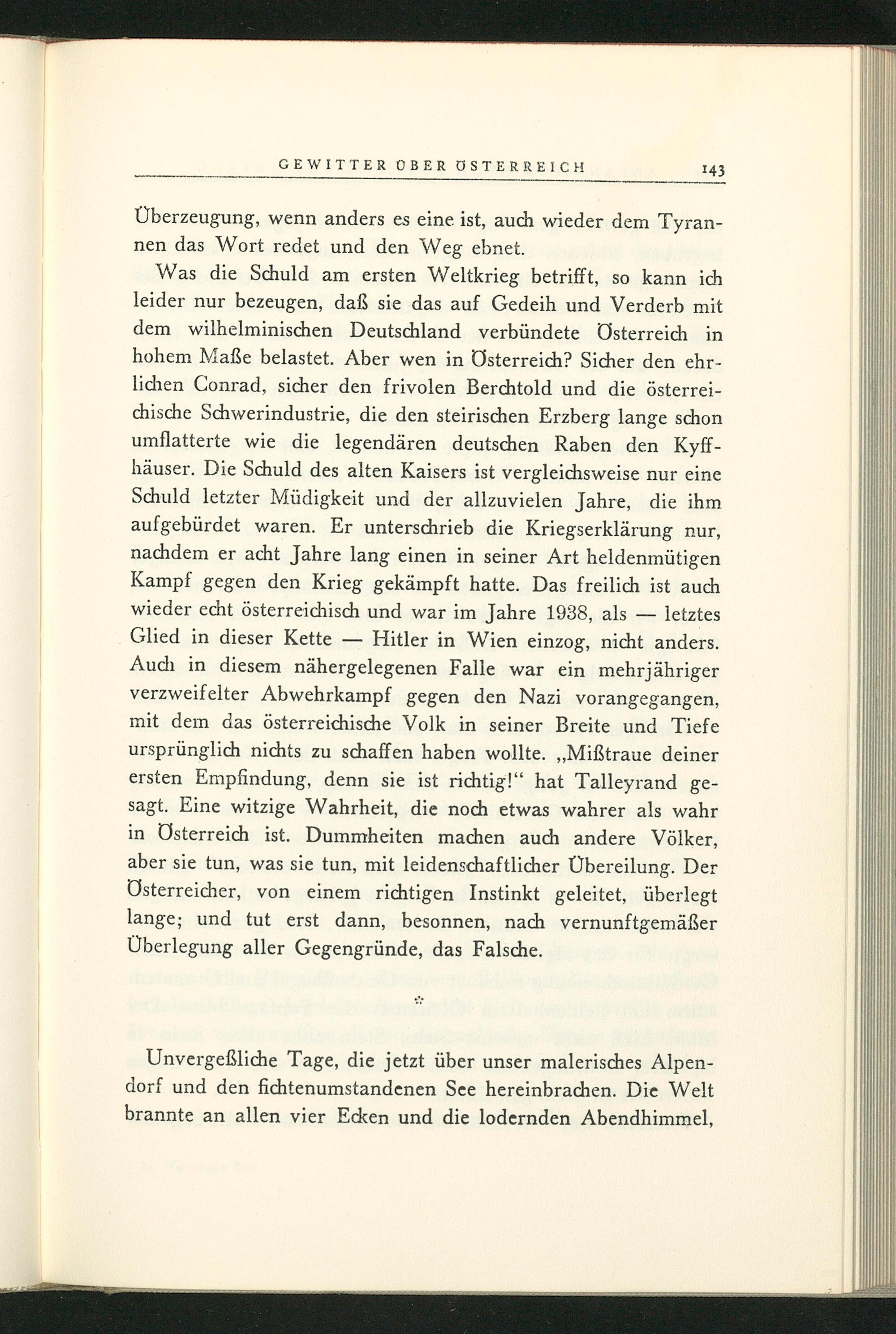Was die Schuld am ersten Weltkrieg betrifft, so kann ich leider nur bezeugen, daß sie das auf Gedeih und Verderb mit dem wilhelminischen Deutschland verbündete Österreich in hohem Maße belastet. Aber wen in Österreich ? Sicher den ehrlichen Conrad, sicher den frivolen Berchtold und die österreichische Schwerindustrie, die den steirischen Erzberg lange schon umflatterte wie die legendären deutschen Raben den Kyffhäuser. Die Schuld des alten Kaisers ist vergleichsweise nur eine Schuld letzter Müdigkeit und der allzuvielen Jahre, die ihm aufgebürdet waren. Er unterschrieb die Kriegserklärung nur, nachdem er acht Jahre lang einen in seiner Art heldenmütigen Kampf gegen den Krieg gekämpft hatte. Das freilich ist auch wieder echt österreichisch und war im Jahre 1938, als letztes Glied in dieser Kette- Hitler in Wien einzog, nicht anders. Auch in diesem nähergelegenen Falle war ein mehrjähriger verzweifelter Abwehrkampf gegen den Nazi vorangegangen, mit dem das österreichische Volk in seiner Breite und Tiefe ursprünglich nichts zu schaffen haben wollte. ,, Mißtraue deiner ersten Empfindung, denn sie ist richtig!" hat Talleyrand gesagt. Eine witzige Wahrheit, die noch etwas wahrer als wahr in Österreich ist. Dummheiten machen auch andere Völker, aber sie tun, was sie tun, mit leidenschaftlicher Übereilung. Der Österreicher, von einem richtigen Instinkt geleitet, überlegt lange; und tut erst dann, besonnen, nach vernunftgemäßer Überlegung aller Gegengründe, das Falsche.