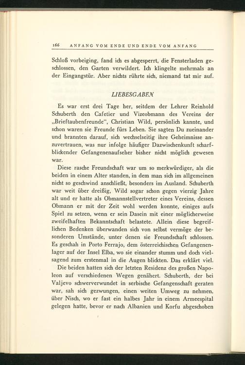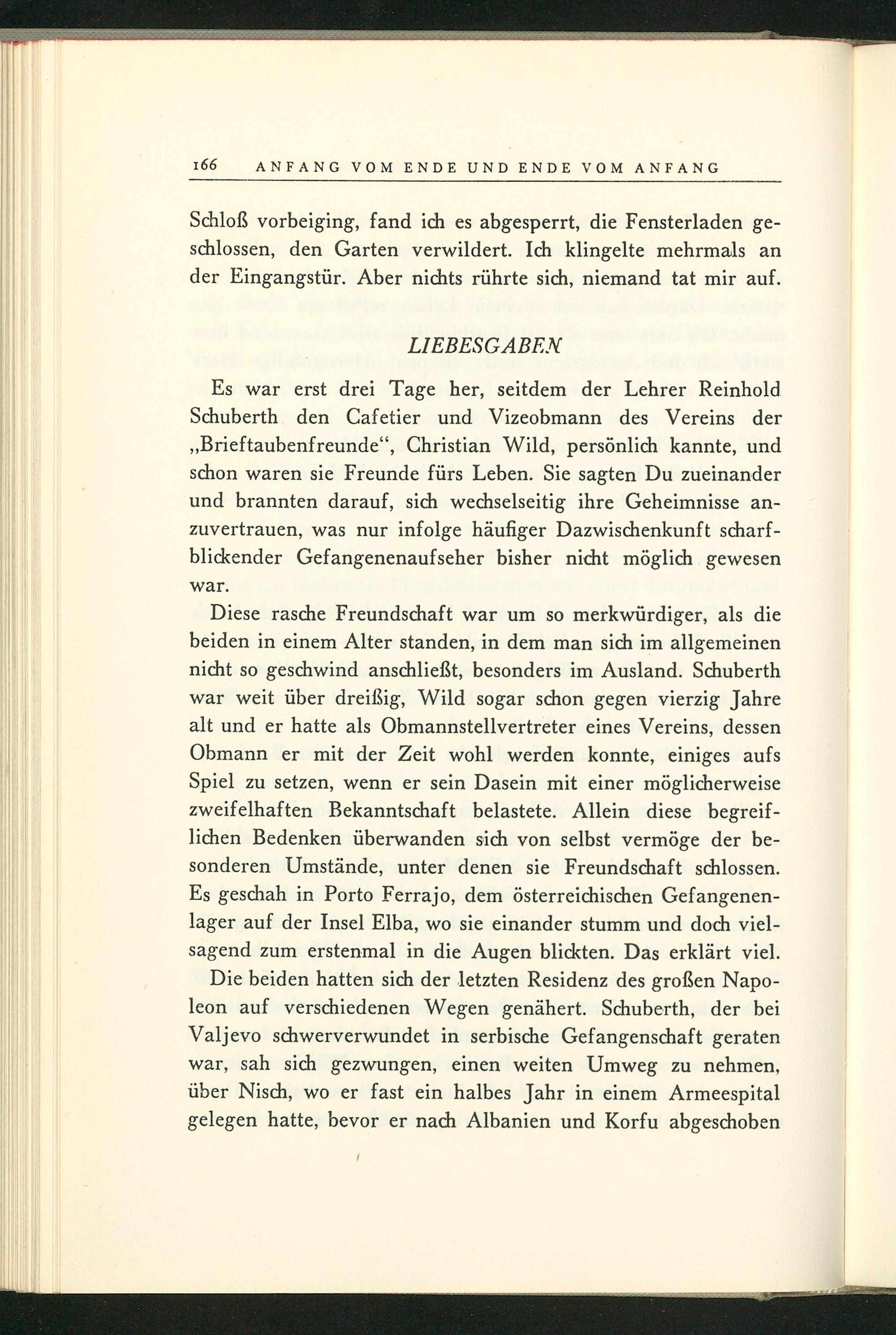 Diese rasche Freundschaft war um so merkwürdiger, als die beiden in einem Alter standen, in dem man sich im allgemeinen nicht so geschwind anschließt, besonders im Ausland. Schuberth war weit über dreißig, Wild sogar schon gegen vierzig Jahre alt und er hatte als Obmannstellvertreter eines Vereins, dessen Obmann er mit der Zeit wohl werden konnte, einiges aufs Spiel zu setzen, wenn er sein Dasein mit einer möglicherweise zweifelhaften Bekanntschaft belastete. Allein diese begreiflichen Bedenken überwanden sich von selbst vermöge der besonderen Umstände, unter denen sie Freundschaft schlossen. Es geschah in Porto Ferrajo, dem österreichischen Gefangenenlager auf der Insel Elba , wo sie einander stumm und doch vielsagend zum erstenmal in die Augen blickten. Das erklärt viel.