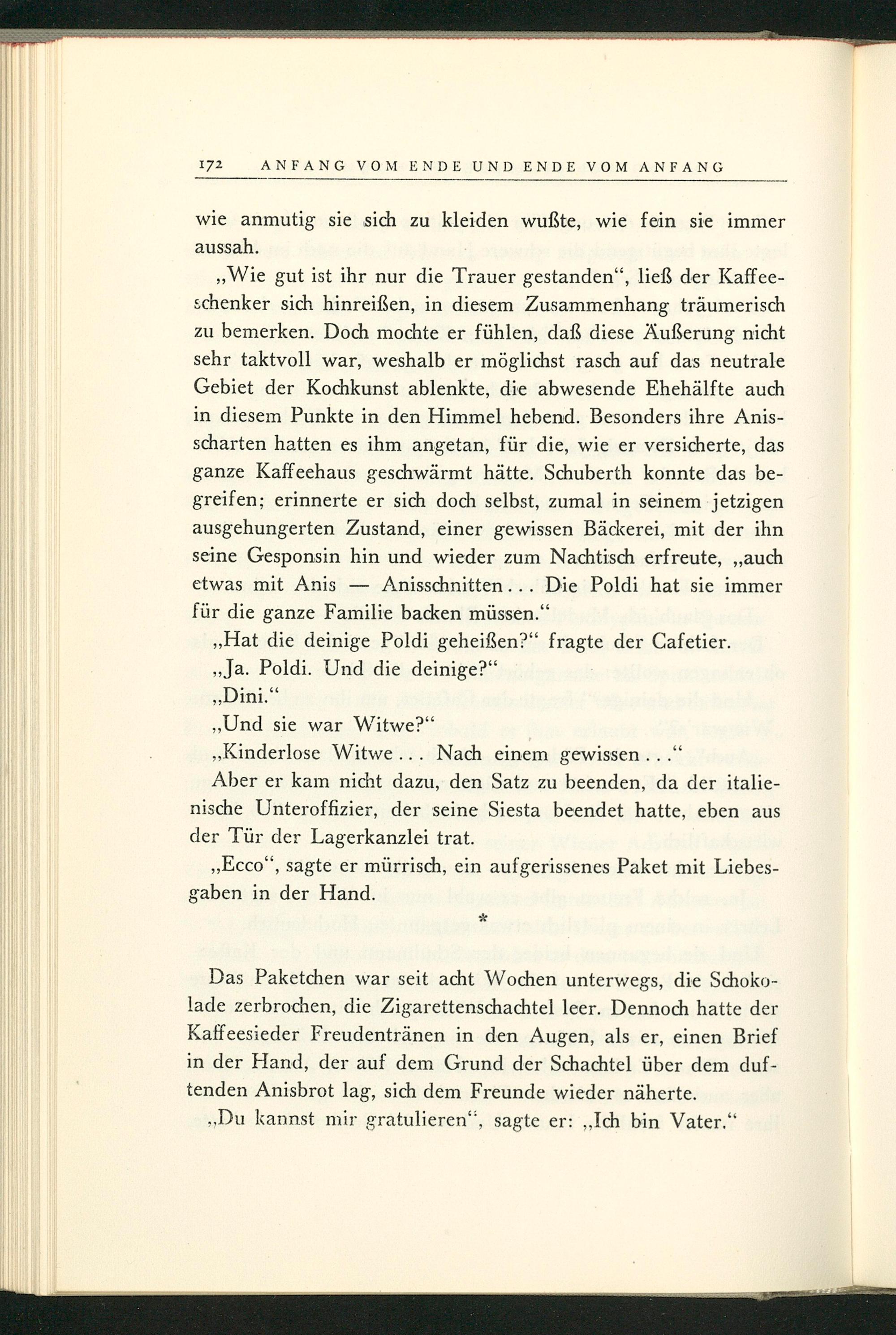 , Wie gut ist ihr nur die Trauer gestanden", ließ der Kaffeeschenker sich hinreißen, in diesem Zusammenhang träumerisch zu bemerken. Doch mochte er fühlen, daß diese Äußerung nicht sehr taktvoll war, weshalb er möglichst rasch auf das neutrale Gebiet der Kochkunst ablenkte, die abwesende Ehehälfte auch in diesem Punkte in den Himmel hebend. Besonders ihre Anisscharten hatten es ihm angetan, für die, wie er versicherte, das ganze Kaffeehaus geschwärmt hätte. Schuberth konnte das begreifen; erinnerte er sich doch selbst, zumal in seinem jetzigen ausgehungerten Zustand, einer gewissen Bäckerei, mit der ihn seine Gesponsin hin und wieder zum Nachtisch erfreute ,,, auch etwas mit Anis Anisschnitten... Die Poldi hat sie immer für die ganze Familie backen müssen."