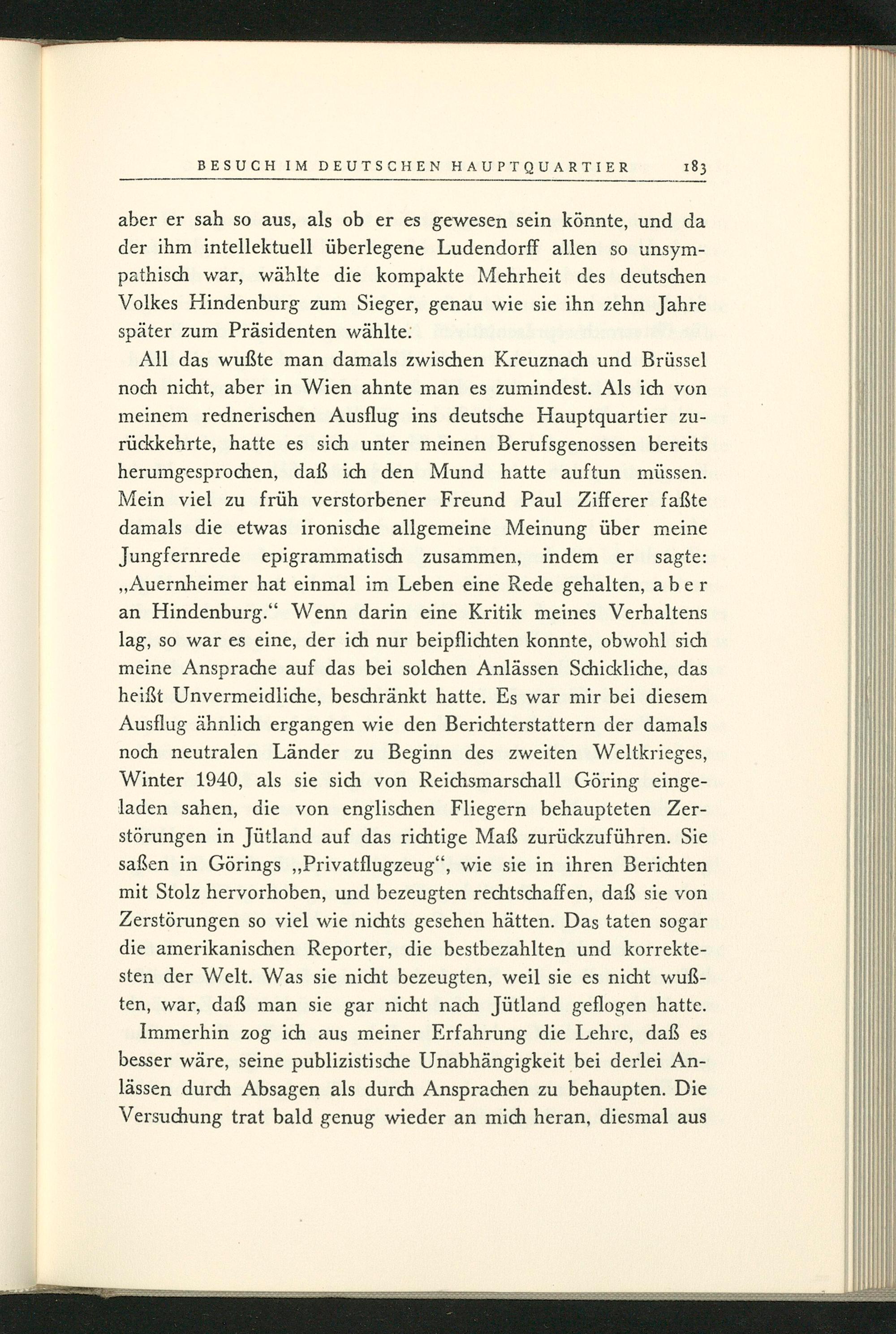 All das wußte man damals zwischen Kreuznach und Brüssel noch nicht, aber in Wien ahnte man es zumindest. Als ich von meinem rednerischen Ausflug ins deutsche Hauptquartier zurückkehrte, hatte es sich unter meinen Berufsgenossen bereits herumgesprochen, daß ich den Mund hatte auftun müssen. Mein viel zu früh verstorbener Freund Paul Zifferer faßte damals die etwas ironische allgemeine Meinung über meine Jungfernrede epigrammatisch zusammen, indem er indem er sagte: ,, Auernheimer hat einmal im Leben eine Rede gehalten, aber an Hindenburg ." Wenn darin eine Kritik meines Verhaltens lag, so war es eine, der ich nur beipflichten konnte, obwohl sich meine Ansprache auf das bei solchen Anlässen Schickliche, das heißt Unvermeidliche, beschränkt hatte. Es war mir bei diesem Ausflug ähnlich ergangen wie den Berichterstattern der damals noch neutralen Länder zu Beginn des zweiten Weltkrieges, Winter 1940, als sie sich von Reichsmarschall Göring eingeladen sahen, die von englischen Fliegern behaupteten Zerstörungen in Jütland auf das richtige Maß zurückzuführen. Sie saßen in Görings ,, Privatflugzeug", wie sie in ihren Berichten mit Stolz hervorhoben, und bezeugten rechtschaffen, daß sie von Zerstörungen so viel wie nichts gesehen hätten. Das taten sogar die amerikanischen Reporter, die bestbezahlten und korrektesten der Welt. Was sie nicht bezeugten, weil sie es nicht wuẞten, war, daß man sie gar nicht nach Jütland geflogen hatte. Immerhin zog ich aus meiner Erfahrung die Lehre, daß es besser wäre, seine publizistische Unabhängigkeit bei derlei Anlässen durch Absagen als durch Ansprachen zu behaupten. Die Versuchung trat bald genug wieder an mich heran, diesmal aus