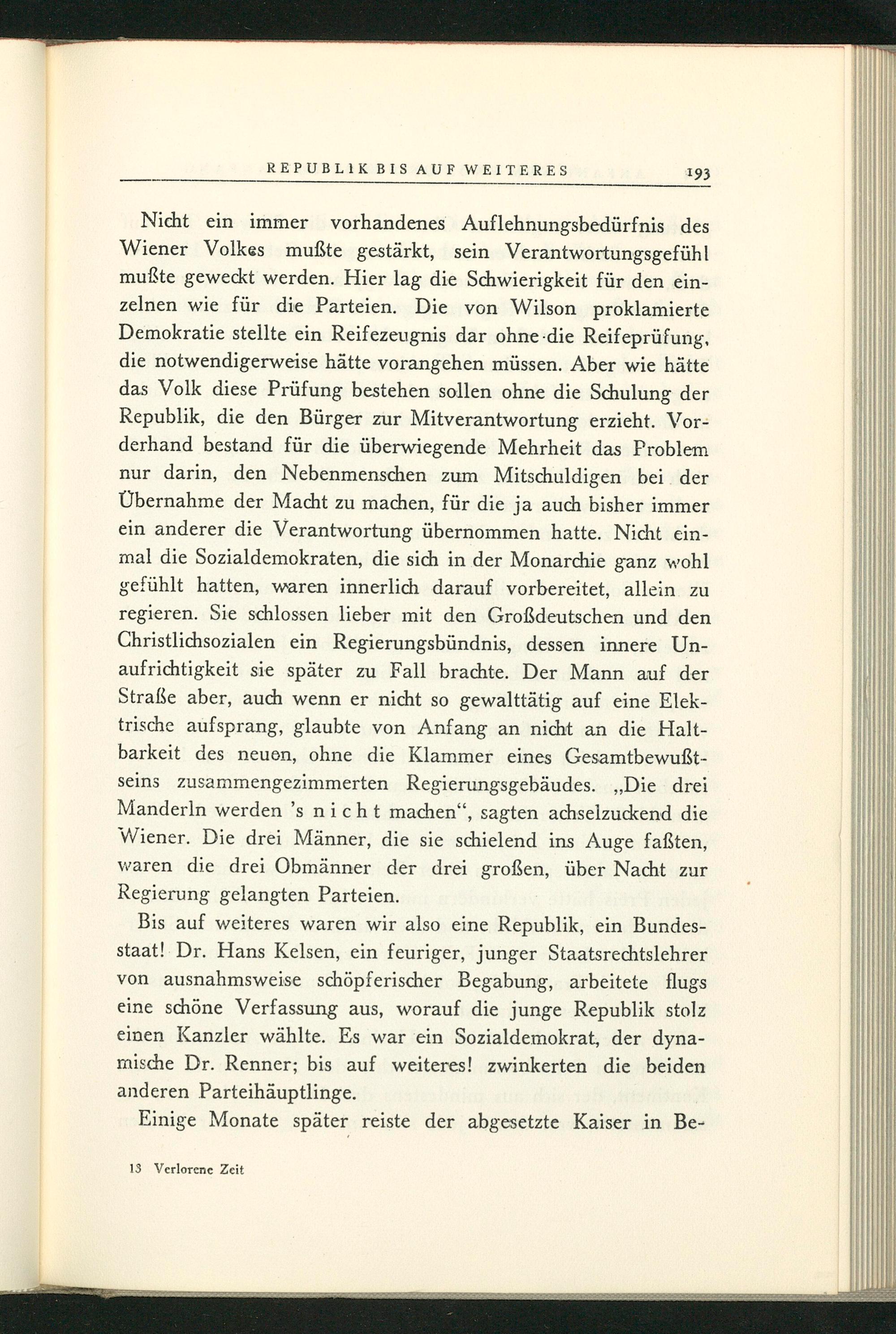 Bis auf weiteres waren wir also eine Republik , ein Bundesstaat! Dr. Hans Kelsen , ein feuriger, junger Staatsrechtslehrer von ausnahmsweise schöpferischer Begabung, arbeitete flugs eine schöne Verfassung aus, worauf die junge Republik stolz einen Kanzler wählte. Es war ein Sozialdemokrat, der dynamische Dr. Renner; bis auf weiteres! zwinkerten die beiden anderen Parteihäuptlinge.