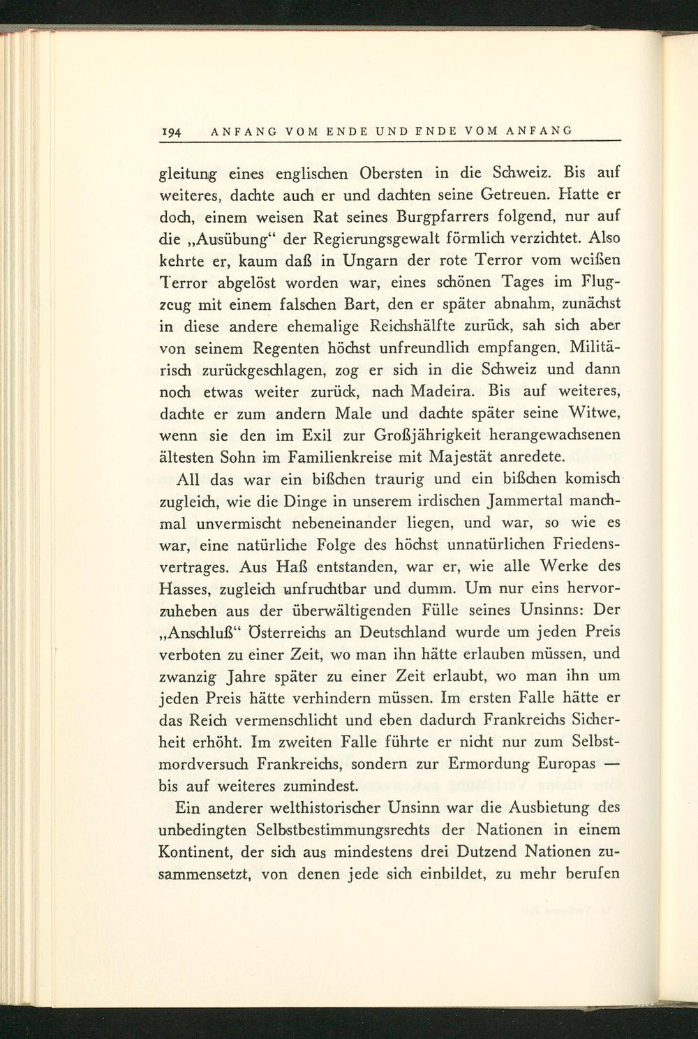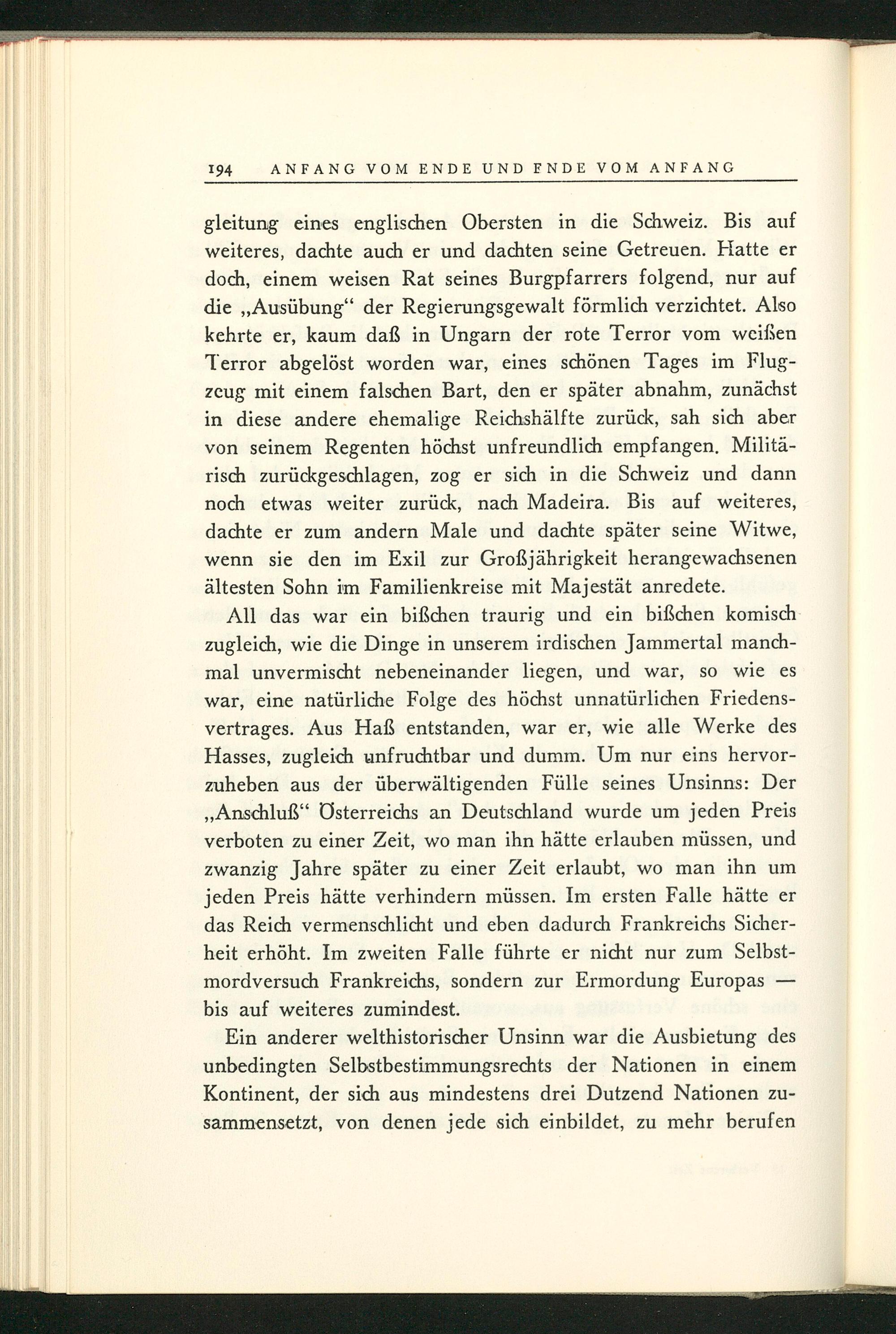 All das war ein bißchen traurig und ein bißchen komisch zugleich, wie die Dinge in unserem irdischen Jammertal manchmal unvermischt nebeneinander liegen, und war, so wie es war, eine natürliche Folge des höchst unnatürlichen Friedensvertrages. Aus Haß entstanden, war er, wie alle Werke des Hasses, zugleich unfruchtbar und dumm. Um nur eins hervorzuheben aus der überwältigenden Fülle seines Unsinns: Der ,, Anschluß" Österreichs an Deutschland wurde um jeden Preis verboten zu einer Zeit, wo man ihn hätte erlauben müssen, und zwanzig Jahre später zu einer Zeit erlaubt, wo man ihn um jeden Preis hätte verhindern müssen. Im ersten Falle hätte er das Reich vermenschlicht und eben dadurch Frankreichs Sicherheit erhöht. Im zweiten Falle führte er nicht nur zum Selbstmordversuch Frankreichs, sondern zur Ermordung Europas bis auf weiteres zumindest.