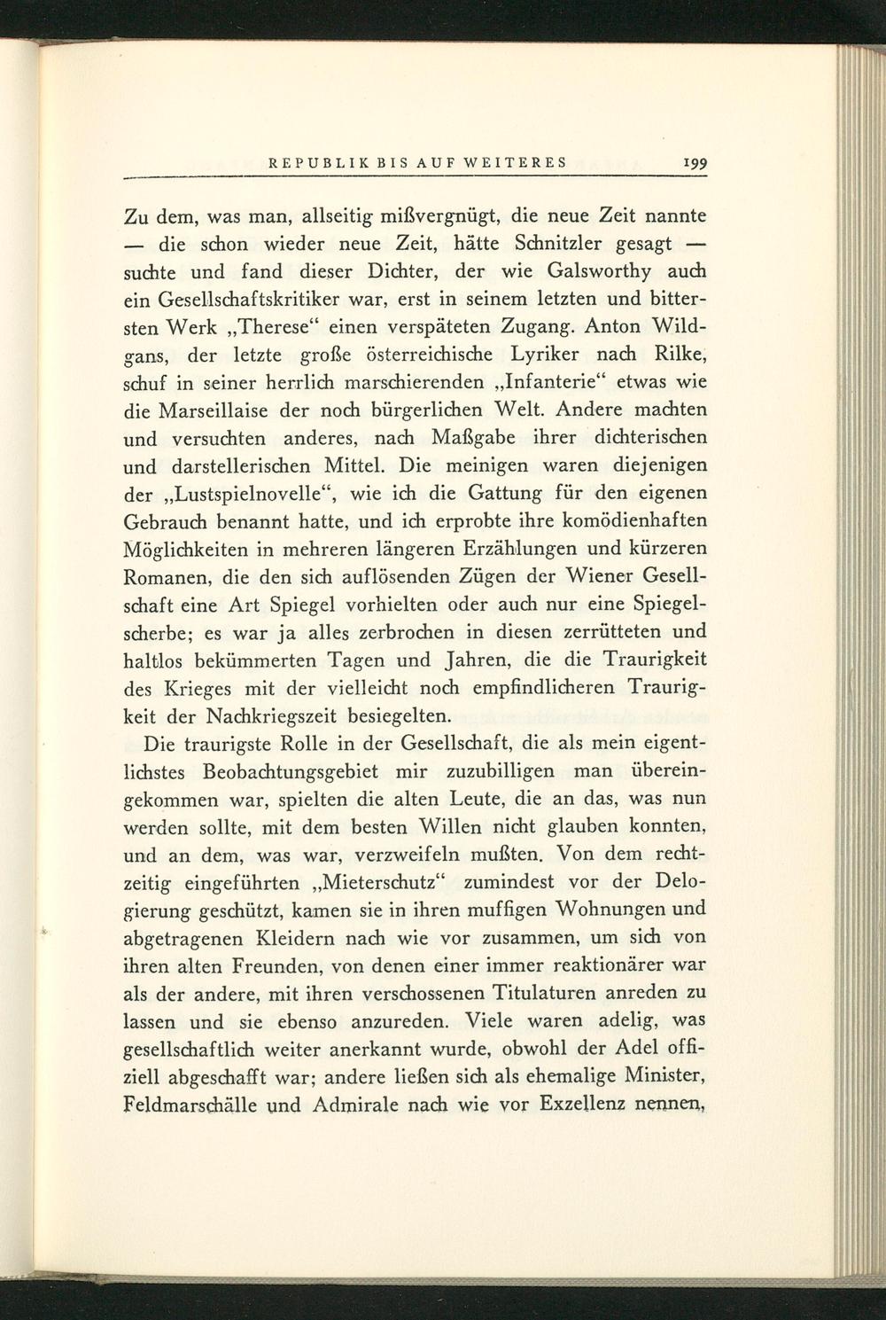 Zu dem, was man, allseitig mißvergnügt, die neue Zeit nannte die schon wieder neue Zeit, hätte Schnitzler gesagt suchte und fand dieser Dichter, der wie Galsworthy auch ein Gesellschaftskritiker war, erst in seinem letzten und bittersten Werk ,, Therese" einen verspäteten Zugang. Anton Wildgans, der letzte große österreichische Lyriker nach Rilke , schuf in seiner herrlich marschierenden„, Infanterie" etwas wie die Marseillaise der noch bürgerlichen Welt. Andere machten und versuchten anderes, nach Maßgabe ihrer dichterischen und darstellerischen Mittel. Die meinigen waren diejenigen der ,, Lustspielnovelle", wie ich die Gattung für den eigenen Gebrauch benannt hatte, und ich erprobte ihre komödienhaften Möglichkeiten in mehreren längeren Erzählungen und kürzeren Romanen, die den sich auflösenden Zügen der Wiener Gesellschaft eine Art Spiegel vorhielten oder auch nur eine Spiegelscherbe; es war ja alles zerbrochen in diesen zerrütteten und haltlos bekümmerten Tagen und Jahren, die die Traurigkeit des Krieges mit der vielleicht noch empfindlicheren Traurigkeit der Nachkriegszeit besiegelten.