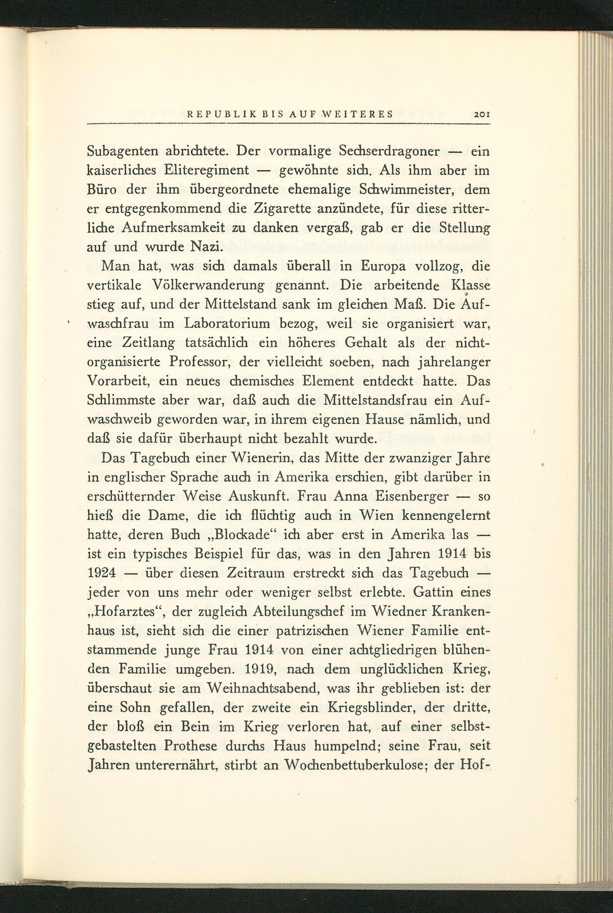 Das Tagebuch einer Wienerin, das Mitte der zwanziger Jahre in englischer Sprache auch in Amerika erschien, gibt darüber in erschütternder Weise Auskunft. Frau Anna Eisenberger hieß die Dame, die ich flüchtig auch in Wien kennengelernt hatte, deren Buch ,, Blockade" ich aber erst in Amerika las ist ein typisches Beispiel für das, was in den Jahren 1914 bis 1924 über diesen Zeitraum erstreckt sich das Tagebuch jeder von uns mehr oder weniger selbst erlebte. Gattin eines ,, Hofarztes", der zugleich Abteilungschef im Wiedner Krankenhaus ist, sieht sich die einer patrizischen Wiener Familie entstammende junge Frau 1914 von einer achtgliedrigen blühenden Familie umgeben. 1919, nach dem unglücklichen Krieg, überschaut sie am Weihnachtsabend, was ihr geblieben ist: der eine Sohn gefallen, der zweite ein Kriegsblinder, der dritte, der bloß ein Bein im Krieg verloren hat, auf einer selbstgebastelten Prothese durchs Haus humpelnd; seine Frau, seit Jahren unterernährt, stirbt an Wochenbettuberkulose; der Hof