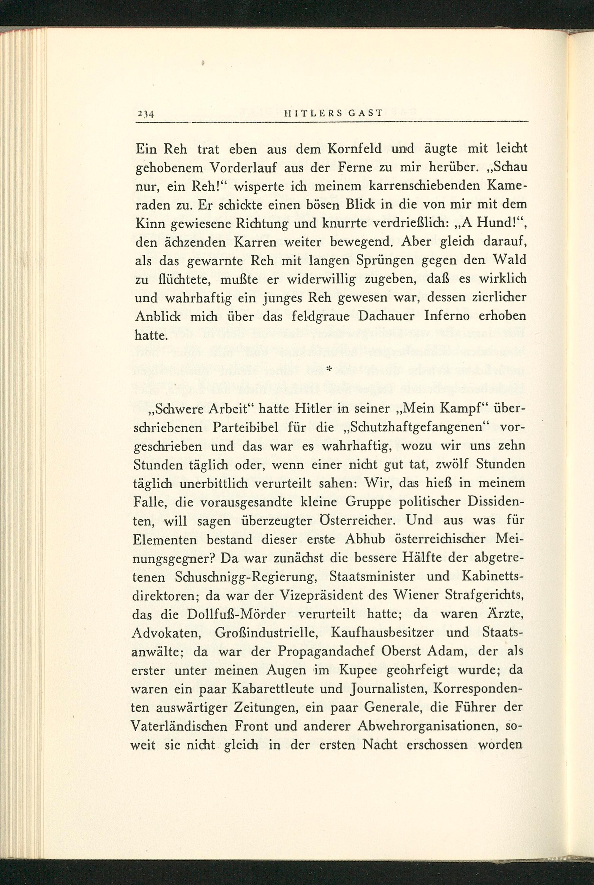 ,, Schwere Arbeit" hatte Hitler in seiner ,, Mein Kampf " überschriebenen Parteibibel für die„, Schutzhaftgefangenen" vorgeschrieben und das war es wahrhaftig, wozu wir uns zehn Stunden täglich oder, wenn einer nicht gut tat, zwölf Stunden täglich unerbittlich verurteilt sahen: Wir, das hieß in meinem Falle, die vorausgesandte kleine Gruppe politischer Dissidenten, will sagen überzeugter Österreicher. Und aus was für Elementen bestand dieser erste Abhub österreichischer Meinungsgegner? Da war zunächst die bessere Hälfte der abgetretenen Schuschnigg - Regierung, Staatsminister und Kabinettsdirektoren; da war der Vizepräsident des Wiener Strafgerichts, das die Dollfuß - Mörder verurteilt hatte; da waren Ärzte, Advokaten, Großindustrielle, Kaufhausbesitzer und Staatsanwälte; da war der Propagandachef Oberst Adam, der als erster unter meinen Augen im Kupee geohrfeigt wurde; da waren ein paar Kabarettleute und Journalisten, Korrespondenten auswärtiger Zeitungen, ein paar Generale, die Führer der Vaterländischen Front und anderer Abwehrorganisationen, soweit sie nicht gleich in der ersten Nacht erschossen worden