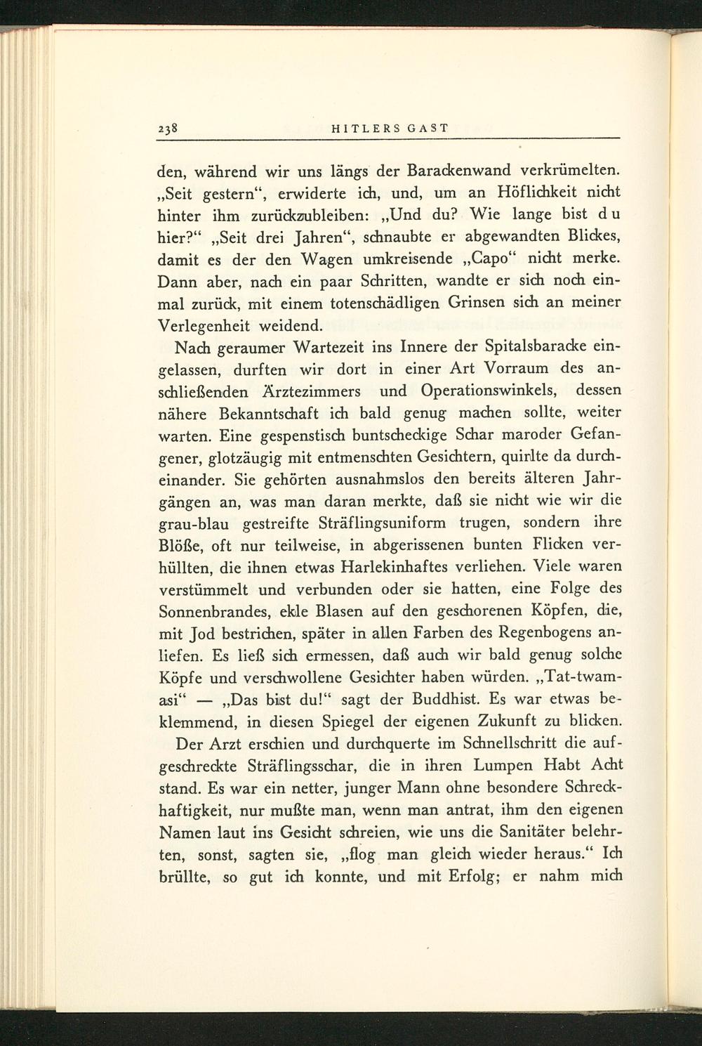 Nach geraumer Wartezeit ins Innere der Spitalsbaracke eingelassen, durften wir dort in einer Art Vorraum des anschließenden Ärztezimmers und Operationswinkels, dessen nähere Bekanntschaft ich bald genug machen sollte, weiter warten. Eine gespenstisch buntscheckige Schar maroder Gefangener, glotzäugig mit entmenschten Gesichtern, quirlte da durcheinander. Sie gehörten ausnahmslos den bereits älteren Jahrgängen an, was man daran merkte, daß sie nicht wie wir die grau- blau gestreifte Sträflingsuniform trugen, sondern ihre Blöße, oft nur teilweise, in abgerissenen bunten Flicken verhüllten, die ihnen etwas Harlekinhaftes verliehen. Viele waren verstümmelt und verbunden oder sie hatten, eine Folge des Sonnenbrandes, ekle Blasen auf den geschorenen Köpfen, die, mit Jod bestrichen, später in allen Farben des Regenbogens anliefen. Es ließ sich ermessen, daß auch wir bald genug solche Köpfe und verschwollene Gesichter haben würden. ,, Tat- twamasi" ,, Das bist du!" sagt der Buddhist. Es war etwas beklemmend, in diesen Spiegel der eigenen Zukunft zu blicken. Der Arzt erschien und durchquerte im Schnellschritt die aufgeschreckte Sträflingsschar, die in ihren Lumpen Habt Acht stand. Es war ein netter, junger Mann ohne besondere Schreckhaftigkeit, nur mußte man, wenn man antrat, ihm den eigenen Namen laut ins Gesicht schreien, wie uns die Sanitäter belehrten, sonst, sagten sie,„, flog man gleich wieder heraus." Ich brüllte, so gut ich konnte, und mit Erfolg; er nahm mich