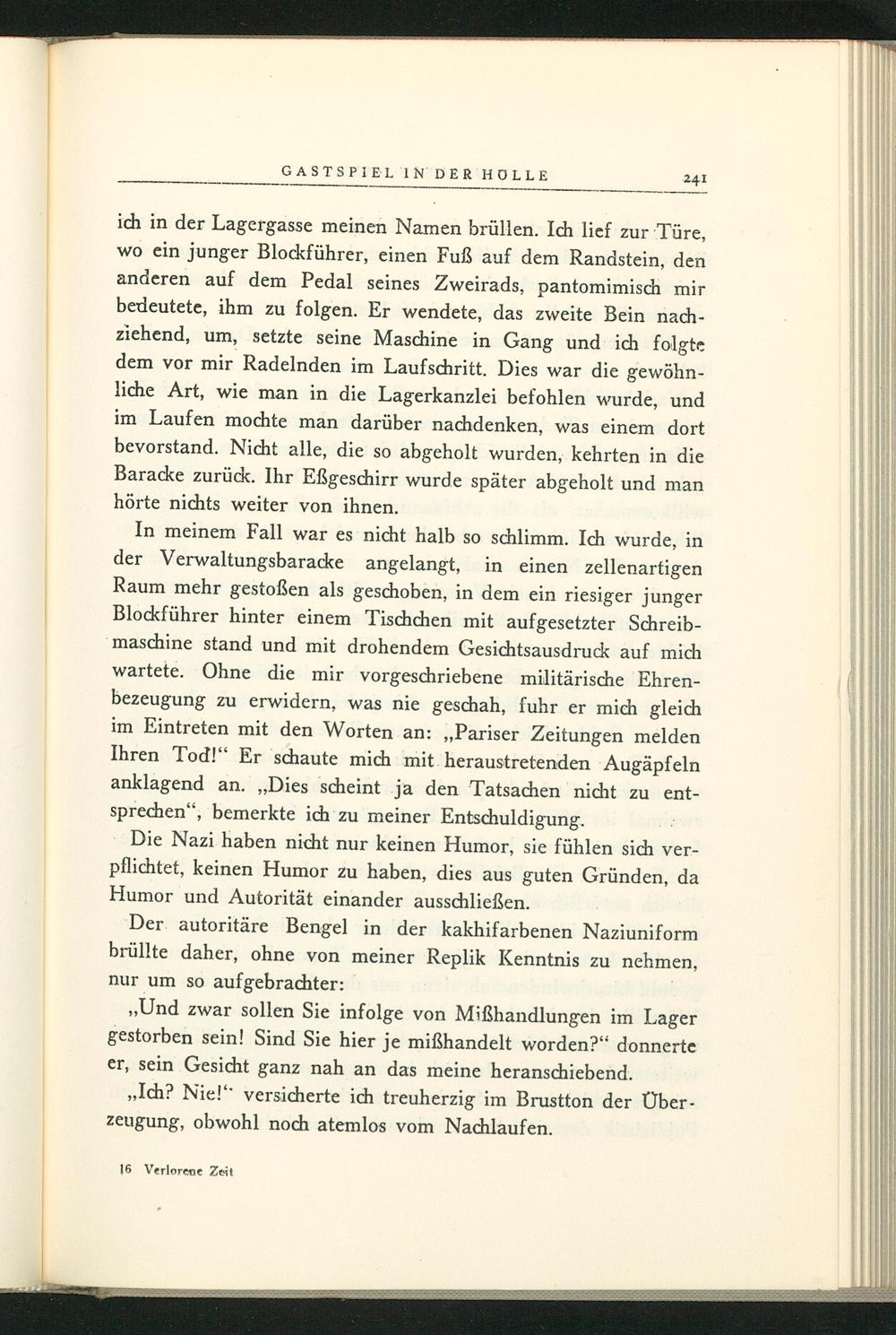 In meinem Fall war es nicht halb so schlimm. Ich wurde, in der Verwaltungsbaracke angelangt, in einen zellenartigen Raum mehr gestoßen als geschoben, in dem ein riesiger junger Blockführer hinter einem Tischchen mit aufgesetzter Schreibmaschine stand und mit drohendem Gesichtsausdruck auf mich wartete. Ohne die mir vorgeschriebene militärische Ehrenbezeugung zu erwidern, was nie geschah, fuhr er mich gleich im Eintreten mit den Worten an: ,, Pariser Zeitungen melden Ihren Tod!" Er schaute mich mit heraustretenden Augäpfeln anklagend an. ,, Dies scheint ja den Tatsachen nicht zu entsprechen", bemerkte ich zu meiner Entschuldigung.
