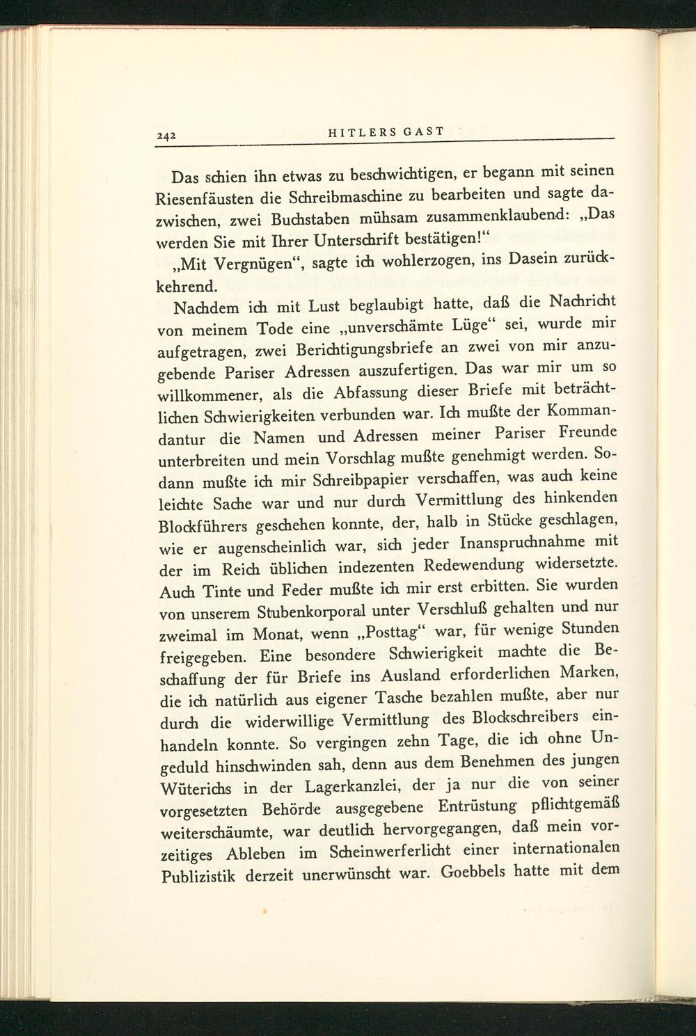 Nachdem ich mit Lust beglaubigt hatte, daß die Nachricht von meinem Tode eine„ unverschämte Lüge" sei, wurde mir aufgetragen, zwei Berichtigungsbriefe an zwei von mir anzugebende Pariser Adressen auszufertigen. Das war mir um so willkommener, als die Abfassung dieser Briefe mit beträchtlichen Schwierigkeiten verbunden war. Ich mußte der Kommandantur die Namen und Adressen meiner Pariser Freunde unterbreiten und mein Vorschlag mußte genehmigt werden. Sodann mußte ich mir Schreibpapier verschaffen, was auch keine leichte Sache war und nur durch Vermittlung des hinkenden Blockführers geschehen konnte, der, halb in Stücke geschlagen, wie er augenscheinlich war, sich jeder Inanspruchnahme mit der im Reich üblichen indezenten Redewendung widersetzte. Auch Tinte und Feder mußte ich mir erst erbitten. Sie wurden von unserem Stubenkorporal unter Verschluß gehalten und nur zweimal im Monat, wenn„ Posttag" war, für wenige Stunden freigegeben. Eine besondere Schwierigkeit machte die Beschaffung der für Briefe ins Ausland erforderlichen Marken, die ich natürlich aus eigener Tasche bezahlen mußte, aber nur durch die widerwillige Vermittlung des Blockschreibers einhandeln konnte. So vergingen zehn Tage, die ich ohne Ungeduld hinschwinden sah, denn aus dem Benehmen des jungen Wüterichs in der Lagerkanzlei, der ja nur die von seiner vorgesetzten Behörde ausgegebene Entrüstung pflichtgemäß weiterschäumte, war deutlich hervorgegangen, daß mein vorzeitiges Ableben im Scheinwerferlicht einer internationalen Publizistik derzeit unerwünscht war. Goebbels hatte mit dem