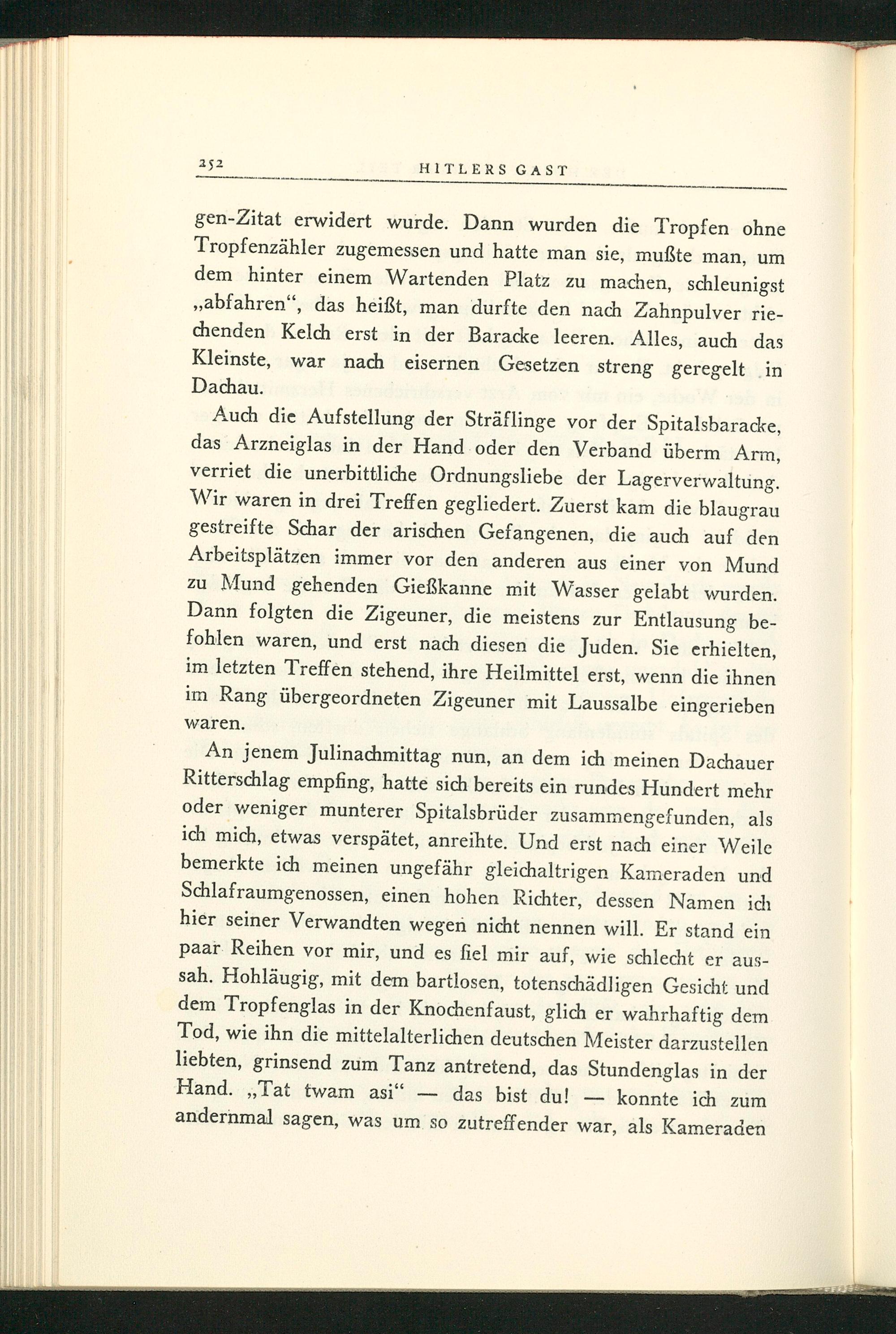 An jenem Julinachmittag nun, an dem ich meinen Dachauer Ritterschlag empfing, hatte sich bereits ein rundes Hundert mehr oder weniger munterer Spitalsbrüder zusammengefunden, als ich mich, etwas verspätet, anreihte. Und erst nach einer Weile bemerkte ich meinen ungefähr gleichaltrigen Kameraden und Schlafraumgenossen, einen hohen Richter, dessen Namen ich hier seiner Verwandten wegen nicht nennen will. Er stand ein paar Reihen vor mir, und es fiel mir auf, wie schlecht er aussah. Hohläugig, mit dem bartlosen, totenschädligen Gesicht und dem Tropfenglas in der Knochenfaust, glich er wahrhaftig dem Tod, wie ihn die mittelalterlichen deutschen Meister darzustellen liebten, grinsend zum Tanz antretend, das Stundenglas in der Hand. Tat twam asi" das bist du! konnte ich zum andernmal sagen, was um so zutreffender war, als Kameraden