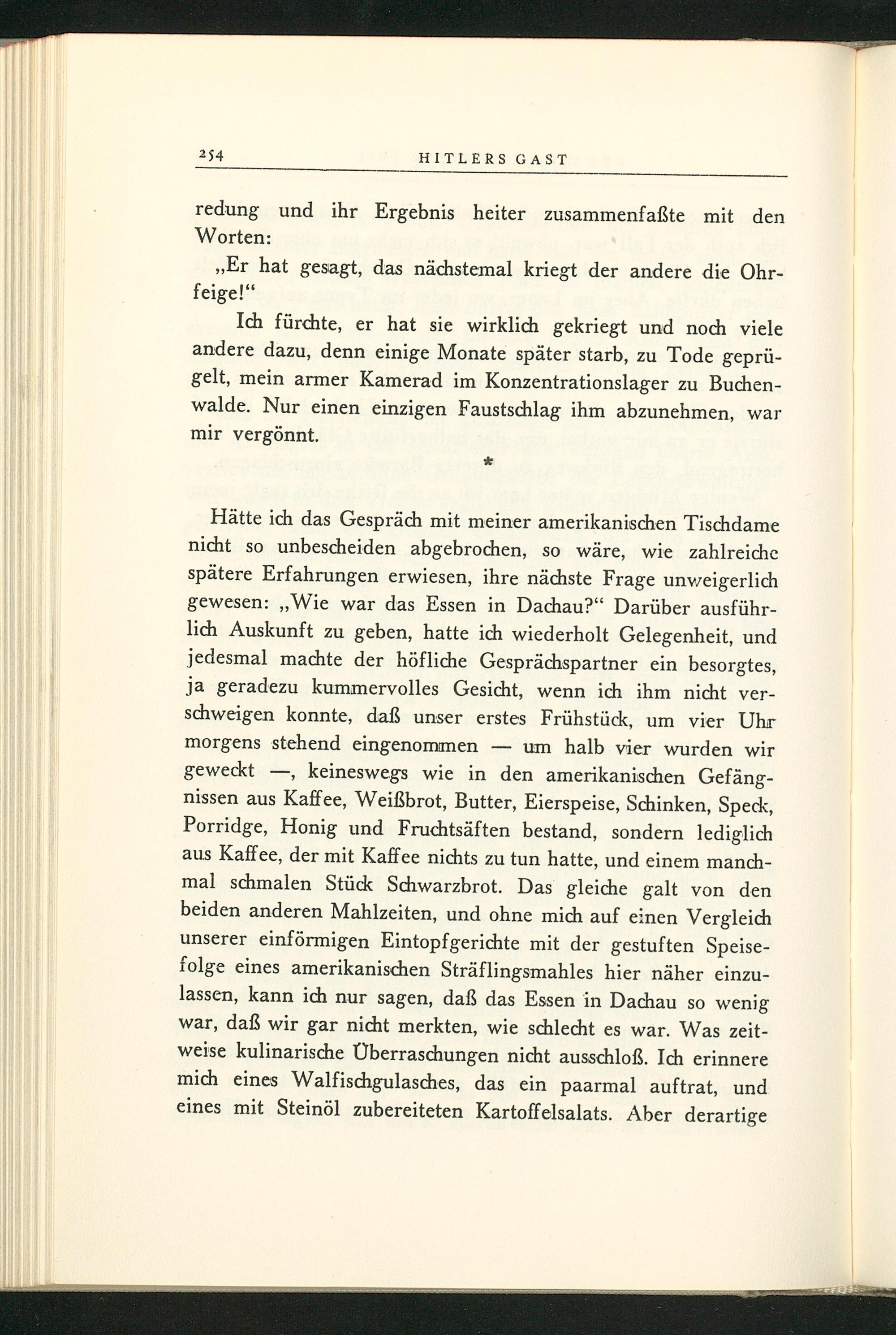 Hätte ich das Gespräch mit meiner amerikanischen Tischdame nicht so unbescheiden abgebrochen, so wäre, wie zahlreiche spätere Erfahrungen erwiesen, ihre nächste Frage unweigerlich gewesen: ,, Wie war das Essen in Dachau ?" Darüber ausführlich Auskunft zu geben, hatte ich wiederholt Gelegenheit, und jedesmal machte der höfliche Gesprächspartner ein besorgtes, ja geradezu kummervolles Gesicht, wenn ich ihm nicht verschweigen konnte, daß unser erstes Frühstück, um vier Uhr morgens stehend eingenommen um halb vier wurden wir geweckt-, keineswegs wie in den amerikanischen Gefängnissen aus Kaffee, Weißbrot, Butter, Eierspeise, Schinken, Speck, Porridge, Honig und Fruchtsäften bestand, sondern lediglich aus Kaffee, der mit Kaffee nichts zu tun hatte, und einem manchmal schmalen Stück Schwarzbrot. Das gleiche galt von den beiden anderen Mahlzeiten, und ohne mich auf einen Vergleich unserer einförmigen Eintopfgerichte mit der gestuften Speisefolge eines amerikanischen Sträflingsmahles hier näher einzulassen, kann ich nur sagen, daß das Essen in Dachau so wenig war, daß wir gar nicht merkten, wie schlecht es war. Was zeitweise kulinarische Überraschungen nicht ausschloß. Ich erinnere mich eines Walfischgulasches, das ein paarmal auftrat, und eines mit Steinöl zubereiteten Kartoffelsalats. Aber derartige