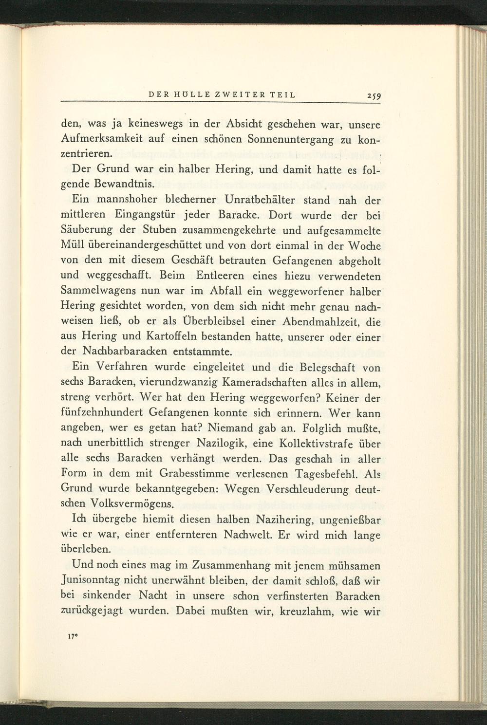 Ein Verfahren wurde eingeleitet und die Belegschaft von sechs Baracken, vierundzwanzig Kameradschaften alles in allem, streng verhört. Wer hat den Hering weggeworfen? Keiner der fünfzehnhundert Gefangenen konnte sich erinnern. Wer kann angeben, wer es getan hat? Niemand gab an. Folglich mußte, nach unerbittlich strenger Nazilogik, eine Kollektivstrafe über alle sechs Baracken verhängt werden. Das geschah in aller Form in dem mit Grabesstimme verlesenen Tagesbefehl. Als Grund wurde bekanntgegeben: Wegen Verschleuderung deutschen Volksvermögens.
