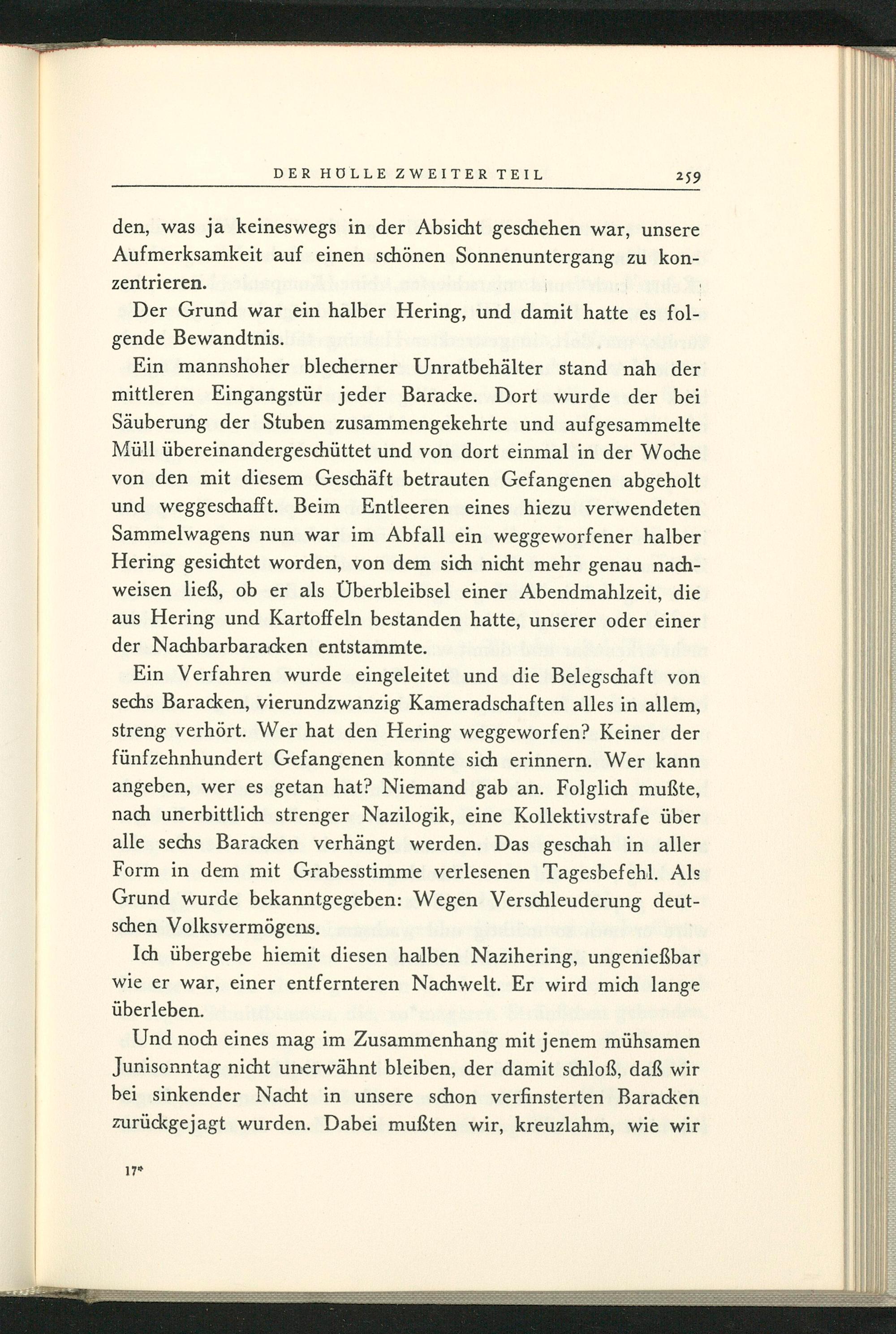 Ein mannshoher blecherner Unratbehälter stand nah der mittleren Eingangstür jeder Baracke. Dort wurde der bei Säuberung der Stuben zusammengekehrte und aufgesammelte Müll übereinandergeschüttet und von dort einmal in der Woche von den mit diesem Geschäft betrauten Gefangenen abgeholt und weggeschafft. Beim Entleeren eines hiezu verwendeten Sammelwagens nun war im Abfall ein weggeworfener halber Hering gesichtet worden, von dem sich nicht mehr genau nachweisen ließ, ob er als Überbleibsel einer Abendmahlzeit, die aus Hering und Kartoffeln bestanden hatte, unserer oder einer der Nachbarbaracken entstammte.