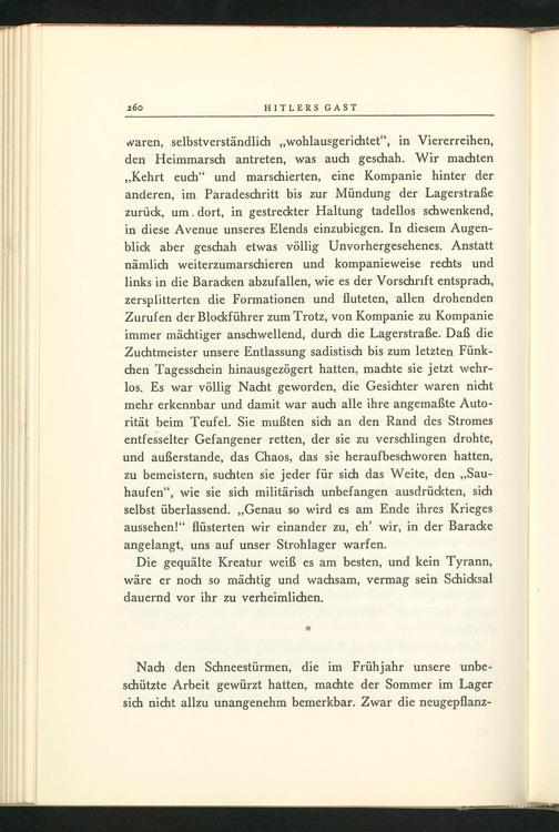 waren, selbstverständlich ,, wohlausgerichtet", in Viererreihen, den Heimmarsch antreten, was auch geschah. Wir machten ,, Kehrt euch" und marschierten, eine Kompanie hinter der anderen, im Paradeschritt bis zur Mündung der Lagerstraße zurück, um dort, in gestreckter Haltung tadellos schwenkend, in diese Avenue unseres Elends einzubiegen. In diesem Augenblick aber geschah etwas völlig Unvorhergesehenes. Anstatt nämlich weiterzumarschieren und kompanieweise rechts und links in die Baracken abzufallen, wie es der Vorschrift entsprach, zersplitterten die Formationen und fluteten, allen drohenden Zurufen der Blockführer zum Trotz, von Kompanie zu Kompanie immer mächtiger anschwellend, durch die Lagerstraße. Daß die Zuchtmeister unsere Entlassung sadistisch bis zum letzten Fünkchen Tagesschein hinausgezögert hatten, machte sie jetzt wehrlos. Es war völlig Nacht geworden, die Gesichter waren nicht mehr erkennbar und damit war auch alle ihre angemaßte Autorität beim Teufel. Sie mußten sich an den Rand des Stromes entfesselter Gefangener retten, der sie zu verschlingen drohte, und außerstande, das Chaos, das sie heraufbeschworen hatten, zu bemeistern, suchten sie jeder für sich das Weite, den ,, Sauhaufen", wie sie sich militärisch unbefangen ausdrückten, sich selbst überlassend. ,, Genau so wird es am Ende ihres Krieges aussehen!" flüsterten wir einander zu, eh' wir, in der Baracke angelangt, uns auf unser Strohlager warfen.