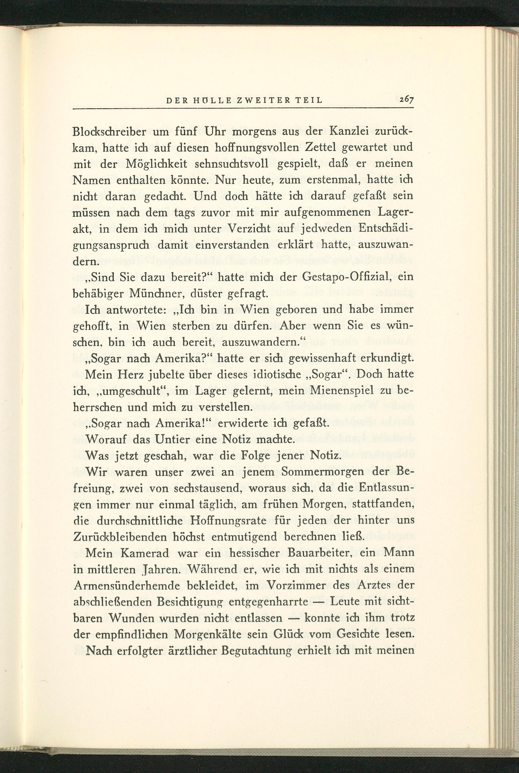 Wir waren unser zwei an jenem Sommermorgen der Befreiung, zwei von sechstausend, woraus sich, da die Entlassungen immer nur einmal täglich, am frühen Morgen, stattfanden, die durchschnittliche Hoffnungsrate für jeden der hinter uns Zurückbleibenden höchst entmutigend berechnen ließ.
