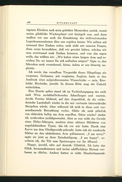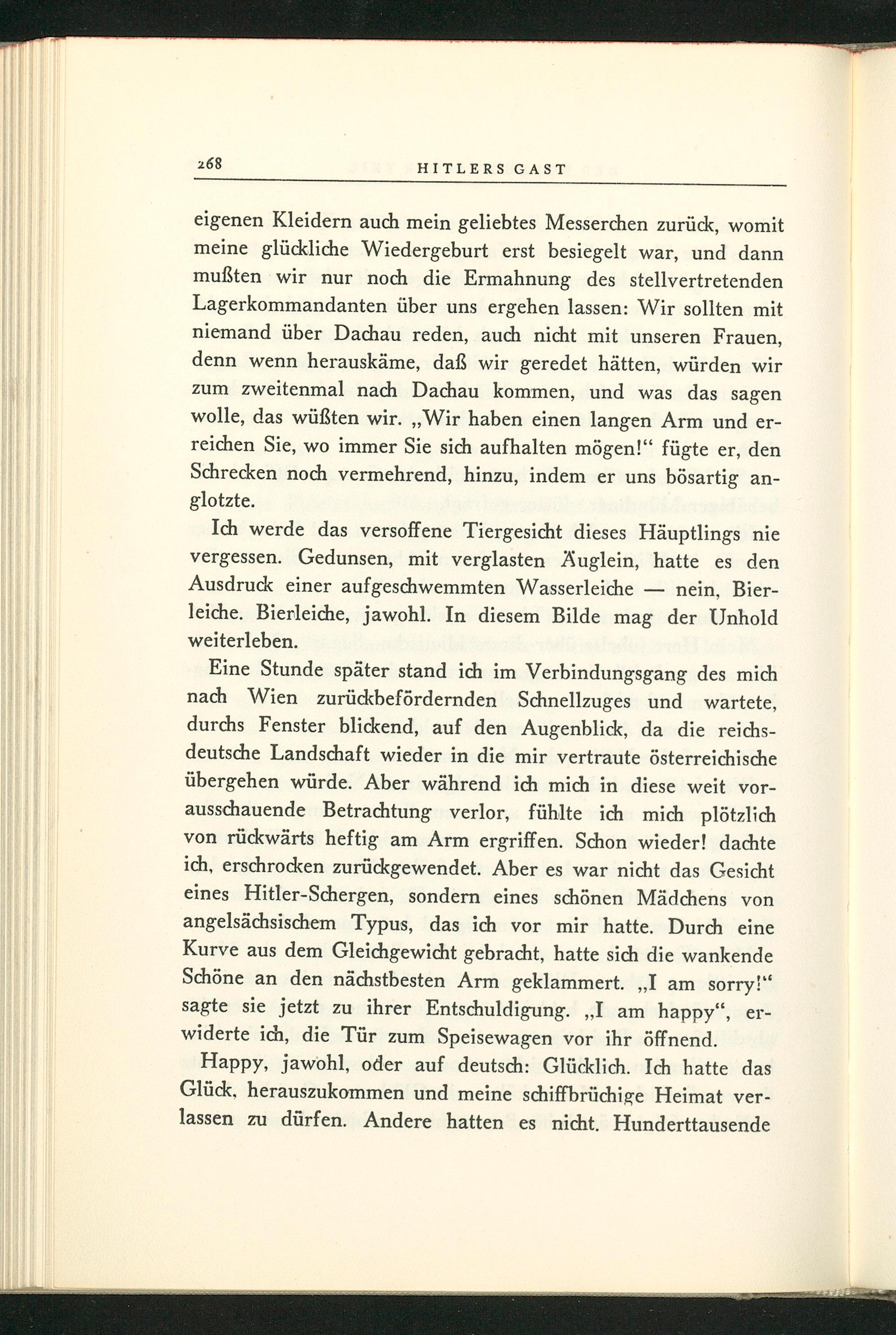 Eine Stunde später stand ich im Verbindungsgang des mich nach Wien zurückbefördernden Schnellzuges und wartete, durchs Fenster blickend, auf den Augenblick, da die reichs- deutsche Landschaft wieder in die mir vertraute österreichische übergehen würde. Aber während ich mich in diese weit vor- ausschauende Betrachtung verlor, fühlte ich mich plötzlich von rückwärts heftig am Arm ergriffen. Schon wieder! dachte ich, erschrocken zurückgewendet. Aber es war nicht das Gesicht eines Hitler-Schergen, sondern eines schönen Mädchens von angelsächsischem Typus, das ich vor mir hatte. Durch eine Kurve aus dem Gleichgewicht gebracht, hatte sich die wankende Schöne an den nächstbesten Arm geklammert.„I am sorry!“ sagte sie jetzt zu ihrer Entschuldigung.„I am happy“, er- widerte ich, die Tür zum Speisewagen vor ihr öffnend.