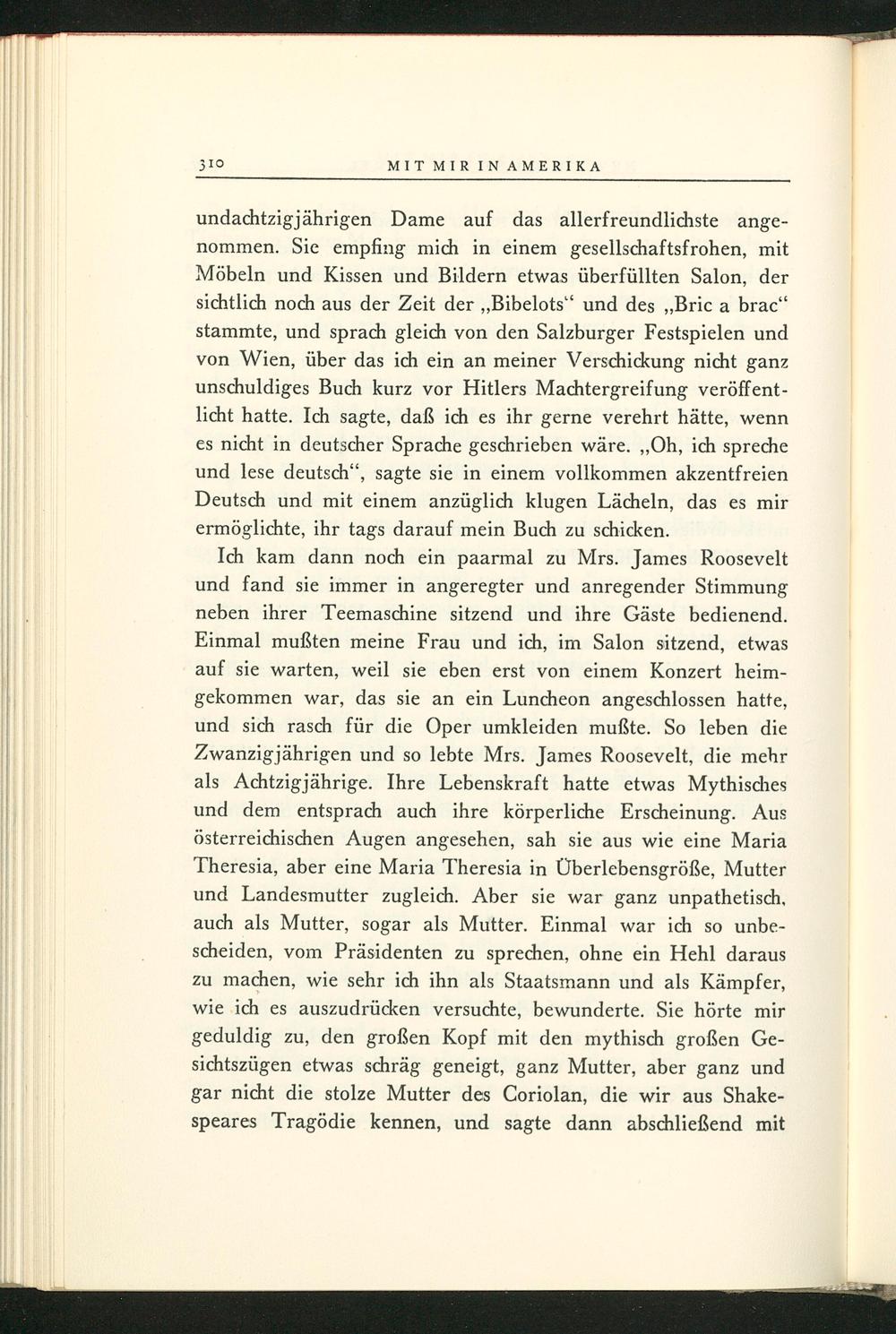 Ich kam dann noch ein paarmal zu Mrs. James Roosevelt und fand sie immer in angeregter und anregender Stimmung neben ihrer Teemaschine sitzend und ihre Gäste bedienend. Einmal mußten meine Frau und ich, im Salon sitzend, etwas auf sie warten, weil sie eben erst von einem Konzert heimgekommen war, das sie an ein Luncheon angeschlossen hatte, und sich rasch für die Oper umkleiden mußte. So leben die Zwanzigjährigen und so lebte Mrs. James Roosevelt , die mehr als Achtzigjährige. Ihre Lebenskraft hatte etwas Mythisches und dem entsprach auch ihre körperliche Erscheinung. Aus österreichischen Augen angesehen, sah sie aus wie eine Maria Theresia, aber eine Maria Theresia in Überlebensgröße, Mutter und Landesmutter zugleich. Aber sie war ganz unpathetisch, auch als Mutter, sogar als Mutter. Einmal war ich so unbescheiden, vom Präsidenten zu sprechen, ohne ein Hehl daraus zu machen, wie sehr ich ihn als Staatsmann und als Kämpfer, wie ich es auszudrücken versuchte, bewunderte. Sie hörte mir geduldig zu, den großen Kopf mit den mythisch großen Gesichtszügen etwas schräg geneigt, ganz Mutter, aber ganz und gar nicht die stolze Mutter des Coriolan, die wir aus Shakespeares Tragödie kennen, und sagte dann abschließend mit