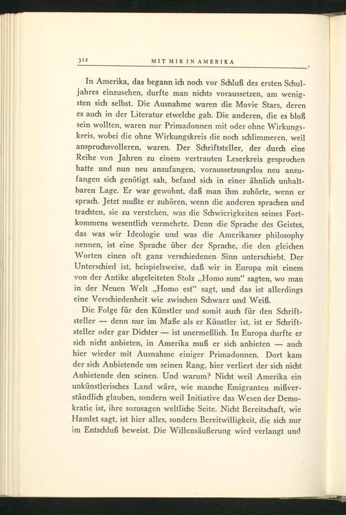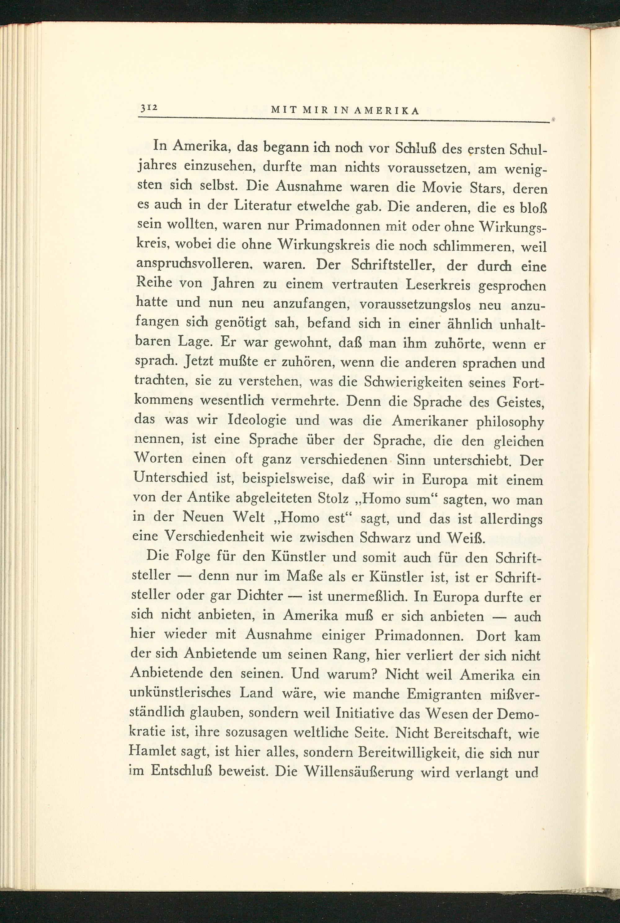 In Amerika , das begann ich noch vor Schluß des ersten Schuljahres einzusehen, durfte man nichts voraussetzen, am wenigsten sich selbst. Die Ausnahme waren die Movie Stars, deren es auch in der Literatur etwelche gab. Die anderen, die es bloẞ sein wollten, waren nur Primadonnen mit oder ohne Wirkungskreis, wobei die ohne Wirkungskreis die noch schlimmeren, weil anspruchsvolleren, waren. Der Schriftsteller, der durch eine Reihe von Jahren zu einem vertrauten Leserkreis gesprochen hatte und nun neu anzufangen, voraussetzungslos neu anzufangen sich genötigt sah, befand sich in einer ähnlich unhaltbaren Lage. Er war gewohnt, daß man ihm zuhörte, wenn er sprach. Jetzt mußte er zuhören, wenn die anderen sprachen und trachten, sie zu verstehen, was die Schwierigkeiten seines Fortkommens wesentlich vermehrte. Denn die Sprache des Geistes, das was wir Ideologie und was die Amerikaner philosophy nennen, ist eine Sprache über der Sprache, die den gleichen Worten einen oft ganz verschiedenen Sinn unterschiebt. Der Unterschied ist, beispielsweise, daß wir in Europa mit einem von der Antike abgeleiteten Stolz ,, Homo sum" sagten, wo man in der Neuen Welt ,, Homo est" sagt, und das ist allerdings eine Verschiedenheit wie zwischen Schwarz und Weiß.