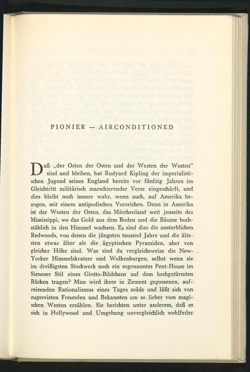aß ,, der Osten der Osten und der Westen der Westen" sind und bleiben, hat Rudyard Kipling der imperialistischen Jugend seines England bereits vor fünfzig Jahren im Gleichtritt militärisch marschierender Verse eingeschärft, und dies bleibt noch immer wahr, wenn auch, auf Amerika bezogen, mit einem antipodischen Vorzeichen. Denn in Amerika ist der Westen der Osten, das Märchenland weit jenseits des Mississippi, wo das Gold aus dem Boden und die Bäume buchstäblich in den Himmel wachsen. Es sind dies die unsterblichen Redwoods, von denen die jüngsten tausend Jahre und die ältesten etwas älter als die ägyptischen Pyramiden, aber von gleicher Höhe sind. Was sind da vergleichsweise die NewYorker Himmelskratzer und Wolkenburgen, selbst wenn sie im dreißigsten Stockwerk noch ein sogenanntes Pent- House im Sieneser Stil eines Giotto- Bildchens auf dem hochgetürmten Rücken tragen? Man wird ihres in Zement gegossenen, aufreizenden Rationalismus eines Tages müde und läßt sich von zugereisten Freunden und Bekannten um so lieber vom magischen Westen erzählen. Sie berichten unter anderem, daß es sich in Hollywood und Umgebung unvergleichlich wohlfeiler