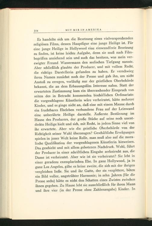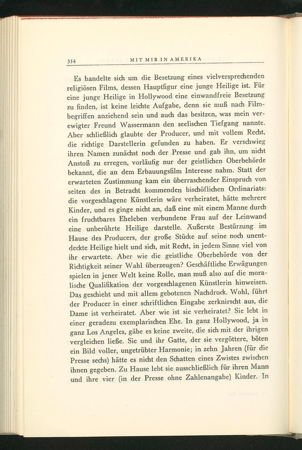 Es handelte sich um die Besetzung eines vielversprechenden religiösen Films, dessen Hauptfigur eine junge Heilige ist. Für eine junge Heilige in Hollywood eine einwandfreie Besetzung zu finden, ist keine leichte Aufgabe, denn sie muß nach Filmbegriffen anziehend sein und auch das besitzen, was mein verewigter Freund Wassermann den seelischen Tiefgang nannte. Aber schließlich glaubte der Producer, und mit vollem Recht, die richtige Darstellerin gefunden zu haben. Er verschwieg ihren Namen zunächst noch der Presse und gab ihn, um nicht Anstoß zu erregen, vorläufig nur der geistlichen Oberbehörde bekannt, die an dem Erbauungsfilm Interesse nahm. Statt der erwarteten Zustimmung kam ein überraschender Einspruch von seiten des in Betracht kommenden bischöflichen Ordinariats: die vorgeschlagene Künstlerin wäre verheiratet, hätte mehrere Kinder, und es ginge nicht an, daß eine mit einem Manne durch ein fruchtbares Eheleben verbundene Frau auf der Leinwand eine unberührte Heilige darstelle. Äußerste Bestürzung im Hause des Producers, der große Stücke auf seine noch unentdeckte Heilige hielt und sich, mit Recht, in jedem Sinne viel von ihr erwartete. Aber wie die geistliche Oberbehörde von der Richtigkeit seiner Wahl überzeugen? Geschäftliche Erwägungen spielen in jener Welt keine Rolle, man muß also auf die moralische Qualifikation der vorgeschlagenen Künstlerin hinweisen. Das geschieht und mit allem gebotenen Nachdruck. Wohl, führt der Producer in einer schriftlichen Eingabe zerknirscht aus, die Dame ist verheiratet. Aber wie ist sie verheiratet? Sie lebt in einer geradezu exemplarischen Ehe. In ganz Hollywood , ja in ganz Los Angeles , gäbe es keine zweite, die sich mit der ihrigen vergleichen ließe. Sie und ihr Gatte, der sie vergöttere, böten ein Bild voller, ungetrübter Harmonie; in zehn Jahren( für die Presse sechs) hätte es nicht den Schatten eines Zwistes zwischen ihnen gegeben. Zu Hause lebt sie ausschließlich für ihren Mann und ihre vier( in der Presse ohne Zahlenangabe) Kinder. In