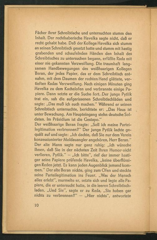 Der weißhaarige Beran fragte: ,, Soll ich meine Parteilegitimation verbrennen?" Der junge Pytlík lachte gequält auf und sagte: ,, Ich dachte, daß Sie nur dem Verein konzessionierter Moldauangler angehören, Herr Beran." Der alte Mann sagte nur ganz ruhig: ,, Ich wünsche Ihnen, daß Sie in der nächsten Zeit Ihren Humor nicht verlieren, Pytlik."- ,, Ich bitte", rief der immer hastiger seine Papiere prüfende Havelka ,,, keine überflüssigen Reden jetzt. Es kann jeden Augenblick jemand kommen." Der alte Beran nickte, ging zum Ofen und steckte seine Parteilegitimation ins Feuer. ,, Was der Mensch alles erlebt", murmelte er, setzte sich und legte alle Papiere, die er untersucht hatte, in die leeren Schreibtischladen. ,, Und Sie", sagte er zu Rada ,,, Sie haben gar nichts zu verbrennen?"- ,, Hier nichts", antwortete