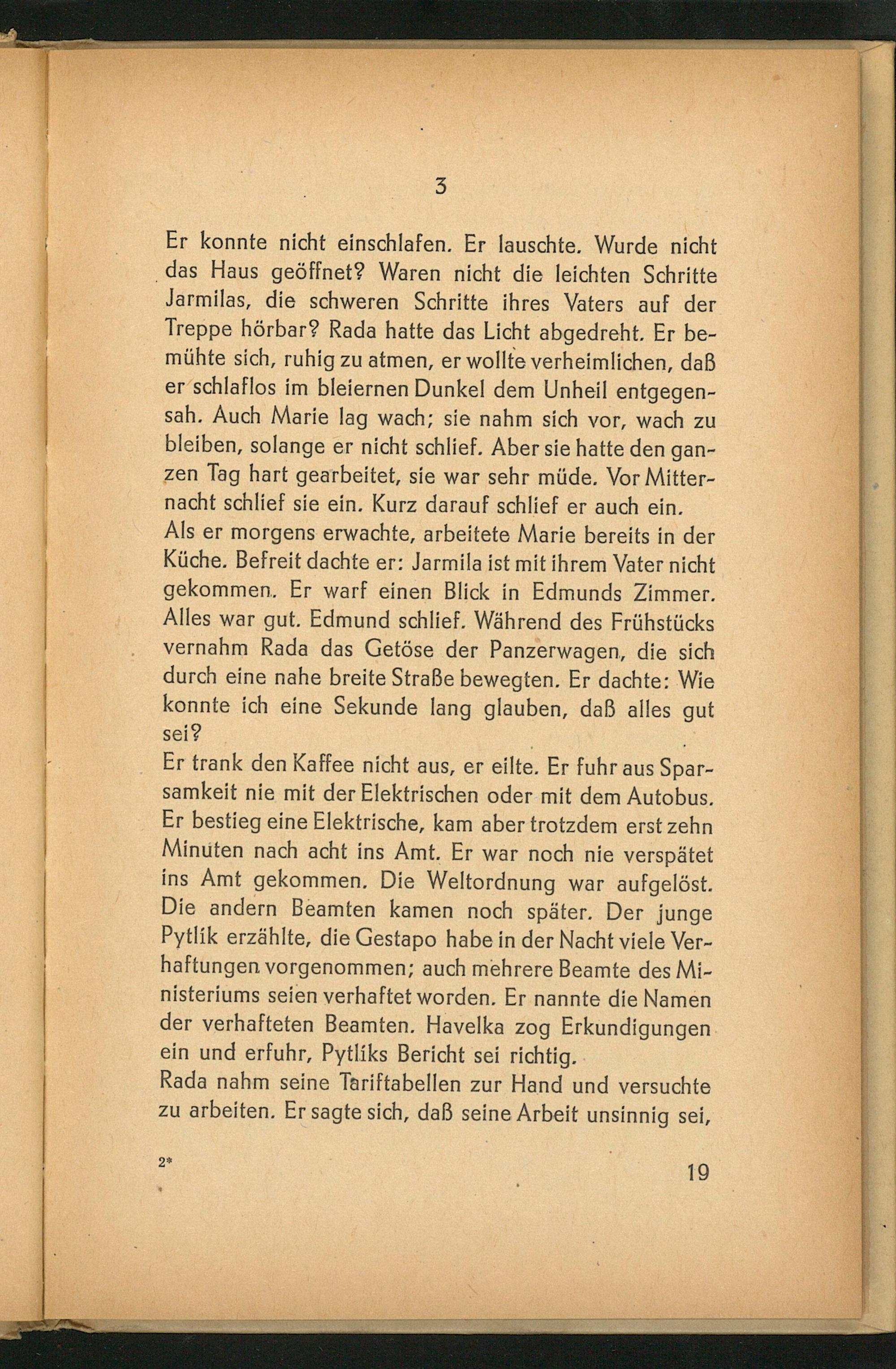 Er konnte nicht einschlafen. Er lauschte. Wurde nicht ‚das Haus geöffnet? Waren nicht die leichten Schritte Jarmilas, die schweren Schritte ihres Vaters auf der Treppe hörbar? Rada hatte das Licht abgedreht. Er be- mühte sich, ruhig zu atmen, er wollte verheimlichen, daß er schlaflos im bleiernen Dunkel dem Unheil entgegen- sah. Auch Marie lag wach; sie nahm sich vor, wach zu bleiben, solange er nicht schlief. Aber sie hatte den gan- zen Tag hart gearbeitet, sie war sehr müde. Vor Mitter- nacht schlief sie ein. Kurz darauf schlief er auch ein. Als er morgens erwachte, arbeitete Marie bereits in der Küche. Befreit dachte er: Jarmila ist mit ihrem Vater nicht gekommen. Er warf einen Blick in Edmunds Zimmer. Alles war gut. Edmund schlief. Während des Frühstücks vernahm Rada das Getöse der Panzerwagen, die sich durch eine nahe breite Straße bewegten. Er dachte: Wie konnte ich eine Sekunde lang glauben, daß alles gut sei?: Er trank den Kaffee nicht aus, er eilte. Er fuhr aus Spar- samkeit nie mit der Elektrischen oder mit dem Autobus. Er bestieg eine Elektrische, kam aber trotzdem erst zehn Minuten nach acht ins Amt. Er war noch nie verspätet ins Amt gekommen. Die Weltordnung war aufgelöst. Die andern Beamten kamen noch später. Der junge Pytlik erzählte, die Gestapo habe in der Nacht viele Ver- haftungen vorgenommen; auch mehrere Beamte des Mi- nisteriums seien verhaftet worden. Er nannte die Namen der verhafteten Beamten. Havelka zog Erkundigungen ein und erfuhr, Pytliks Bericht sei richtig.