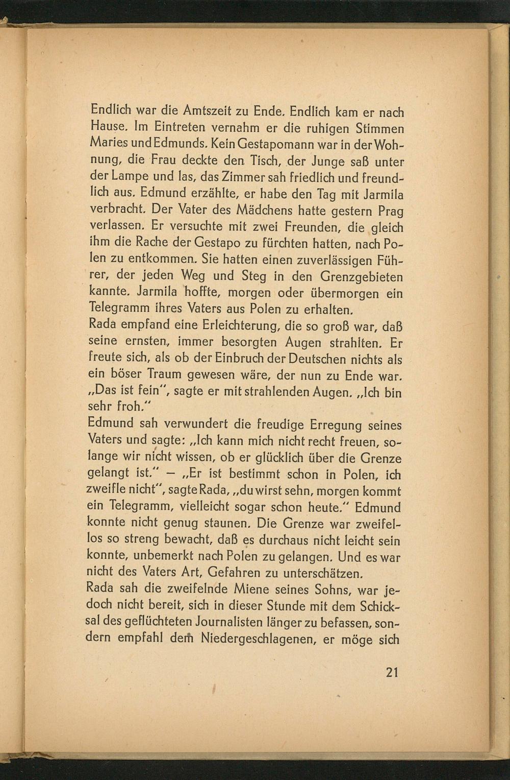 Endlich war die Amtszeit zu Ende. Endlich kam er nach Hause. Im Eintreten vernahm er die ruhigen Stimmen Maries und Edmunds. Kein Gestapomann war in der Wohnung, die Frau deckte den Tisch, der Junge saß unter der Lampe und las, das Zimmer sah friedlich und freundlich aus. Edmund erzählte, er habe den Tag mit Jarmila verbracht. Der Vater des Mädchens hatte gestern Prag verlassen. Er versuchte mit zwei Freunden, die gleich ihm die Rache der Gestapo zu fürchten hatten, nach Polen zu entkommen. Sie hatten einen zuverlässigen Führer, der jeden Weg und Steg in den Grenzgebieten kannte. Jarmila hoffte, morgen oder übermorgen ein Telegramm ihres Vaters aus Polen zu erhalten.