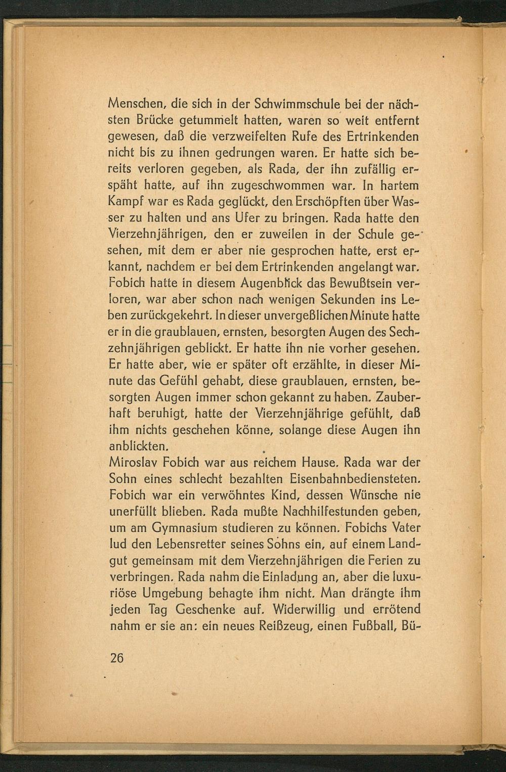 Menschen, die sich in der Schwimmschule bei der nächsten Brücke getummelt hatten, waren so weit entfernt gewesen, daß die verzweifelten Rufe des Ertrinkenden nicht bis zu ihnen gedrungen waren. Er hatte sich bereits verloren gegeben, als Rada, der ihn zufällig erspäht hatte, auf ihn zugeschwommen war. In hartem Kampf war es Rada geglückt, den Erschöpften über Wasser zu halten und ans Ufer zu bringen. Rada hatte den Vierzehnjährigen, den er zuweilen in der Schule gesehen, mit dem er aber nie gesprochen hatte, erst erkannt, nachdem er bei dem Ertrinkenden angelangt war. Fobich hatte in diesem Augenblick das Bewußtsein verloren, war aber schon nach wenigen Sekunden ins Leben zurückgekehrt. In dieser unvergeßlichen Minute hatte er in die graublauen, ernsten, besorgten Augen des Sechzehnjährigen geblickt. Er hatte ihn nie vorher gesehen. Er hatte aber, wie er später oft erzählte, in dieser Minute das Gefühl gehabt, diese graublauen, ernsten, besorgten Augen immer schon gekannt zu haben. Zauberhaft beruhigt, hatte der Vierzehnjährige gefühlt, daß ihm nichts geschehen könne, solange diese Augen ihn anblickten.
