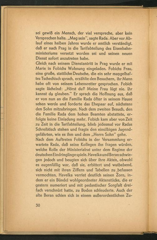 Gleich nach seinem Dienstantritt in Prag wurde er mit Marie in Fobichs Wohnung eingeladen. Fobichs Frau, eine große, stattliche Deutsche, die ein sehr mangelhaftes Tschechisch sprach, erzählte den Besuchern, ihr Mann habe oft von seinem Lebensretter gesprochen. Fobich sagte lächelnd: ,, Hörst du? Meine Frau lügt nie. Ihr kannst du glauben." Er sprach die Hoffnung aus, daß er von nun an die Familie Rada öfter in seinem Hause sehen werde und forderte das Ehepaar auf, nächstens den Sohn mitzubringen. Nach dem zweiten Besuch, den die Familie Rada dem hohen Beamten abstattete, erfolgte keine Einladung mehr. Fobich kam aber von Zeit zu Zeit in die Tarifabteilung, blieb jedesmal vor Radas Schreibtisch stehen und fragte den einsilbigen Jugendgefährten, wie es ihm und dem ,, Herrn Sohn" gehe. Nach dem Auftreten Fobichs in der Versammlung erwartete Rada, daß seine Kollegen ihn fragen würden, welche Rolle der Ministerialrat unter dem Regime der deutschen Eindringlinge spiele. Havelka und Beran schwiegen jedoch und beugten sich über ihre Akten, obwohl es augenfällig war, daß sie, erbittert und wutbebend, sich nicht mit ihren Ziffern und Tabellen zu befassen vermochten. Havelka verriet deutlich seinen Zorn, indem er ein Bündel wohlgeordneter Aktenstücke, die er gestern numeriert und mit pedantischer Sorgfalt dreifach verschnürt hatte, zu Boden schleuderte. Auch der alte Beran schien sich in einem außerordentlichen Zu