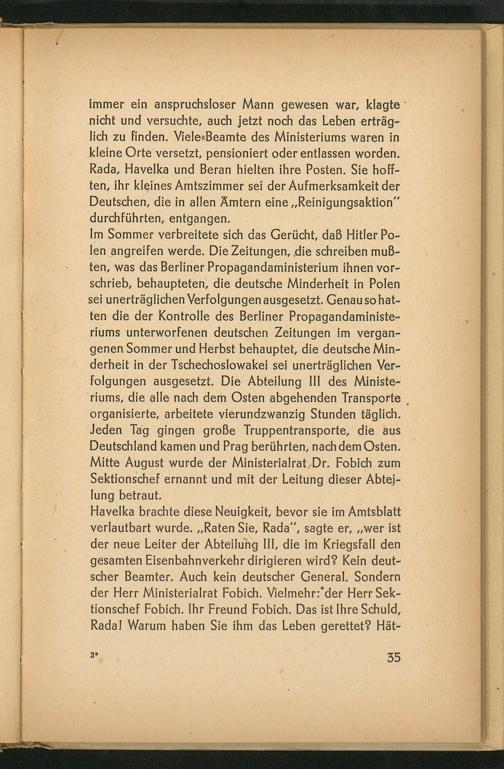 Im Sommer verbreitete sich das Gerücht, daß Hitler Po- len angreifen werde. Die Zeitungen, die schreiben muß- ten, was das Berliner Propagandaministerium ihnen vor- schrieb, behaupteten, die deutsche Minderheit in Polen sei unerträglichen Verfolgungen ausgesetzt. Genauso hat- ten die der Kontrolle des Berliner Propagandaministe- riums unterworfenen deutschen Zeitungen im vergan- genen Sommer und Herbst behauptet, die deutsche Min- derheit in der Tschechoslowakei sei unerträglichen Ver- folgungen ausgesetzt. Die Abteilung III des Ministe- riums, die alle nach dem Osten abgehenden Transporte, organisierte, arbeitete vierundzwanzig Stunden täglich. Jeden Tag gingen große Truppentransporte, die aus Deutschland kamen und Prag berührten, nach dem Osten. Mitte August wurde der Ministerialrat,Dr. Fobich zum Sektionschef ernannt und mit der Leitung dieser Abtei- lung betraut.