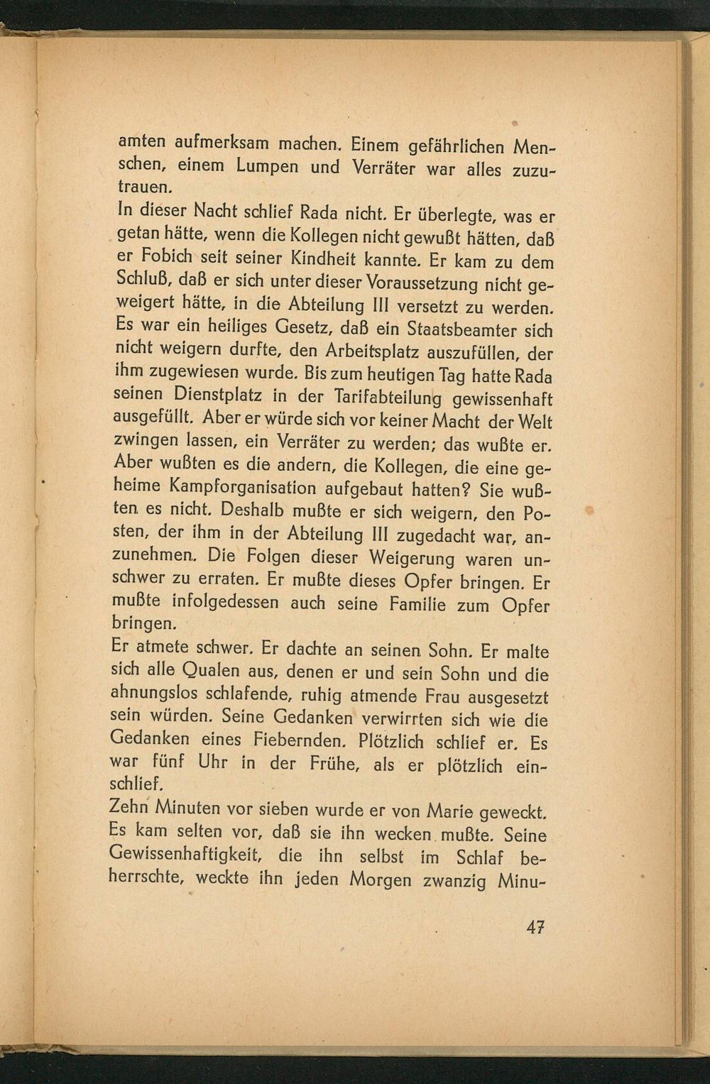 In dieser Nacht schlief Rada nicht. Er überlegte, was er getan hätte, wenn die Kollegen nicht gewußt hätten, daß er Fobich seit seiner Kindheit kannte. Er kam zu dem Schluß, daß er sich unter dieser Voraussetzung nicht geweigert hätte, in die Abteilung III versetzt zu werden. Es war ein heiliges Gesetz, daß ein Staatsbeamter sich nicht weigern durfte, den Arbeitsplatz auszufüllen, der ihm zugewiesen wurde. Bis zum heutigen Tag hatte Rada seinen Dienstplatz in der Tarifabteilung gewissenhaft ausgefüllt. Aber er würde sich vor keiner Macht der Welt zwingen lassen, ein Verräter zu werden; das wußte er. Aber wußten es die andern, die Kollegen, die eine geheime Kampforganisation aufgebaut hatten? Sie wuẞten es nicht. Deshalb mußte er sich weigern, den Posten, der ihm in der Abteilung III zugedacht war, anzunehmen. Die Folgen dieser Weigerung waren unschwer zu erraten. Er mußte dieses Opfer bringen. Er mußte infolgedessen auch seine Familie zum Opfer bringen.